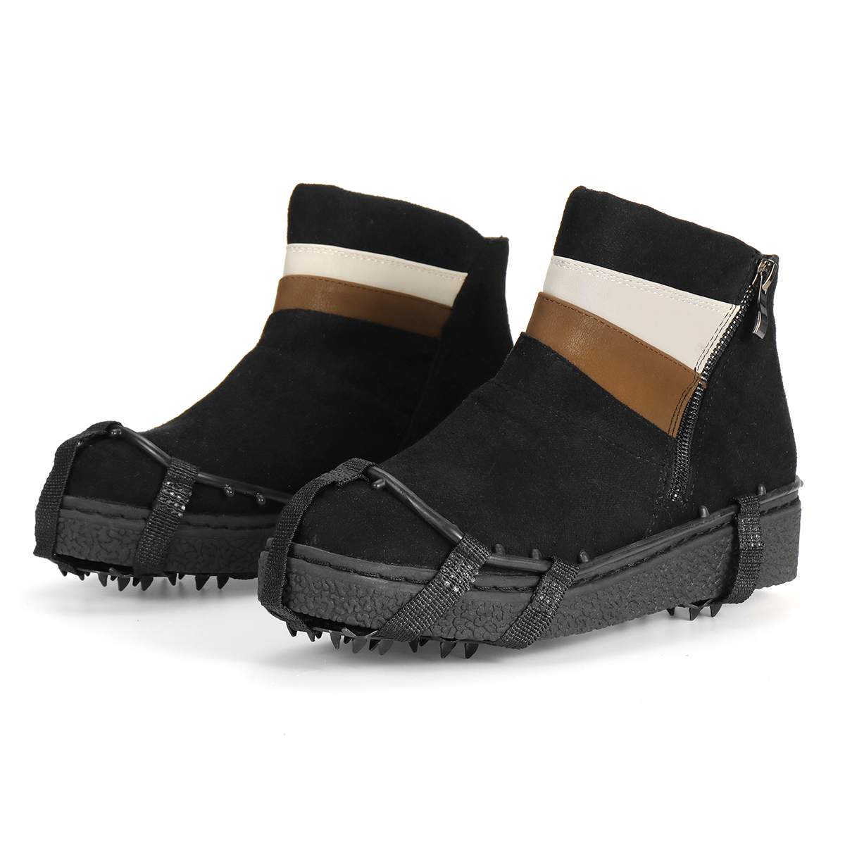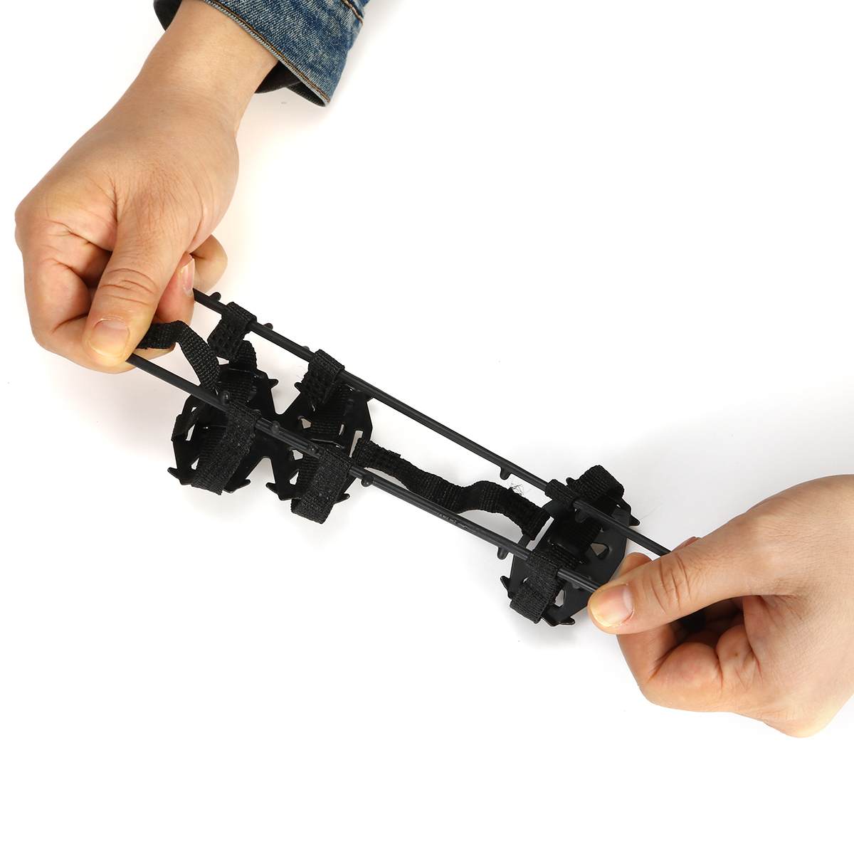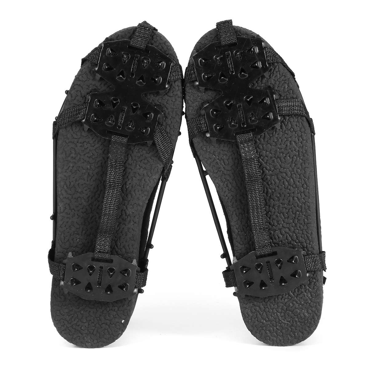 Note: 1. The Shoes are not included. 2. This is a mountain climbing outdoor aid. Do not use it as a professional tool. Specification: · Color: Black · Size: M: 34-40; L: 41-45 · Material: Steel + PP Plastic + High elastic rubber · It has good ductility and can withstand freezing in a temperature range of -40 degrees. · Used in a variety of outdoor sports shoes, hiking shoes and mountain boots, suitable for ice, grass and other environments. · Keep it clean after use, then dry and collect it. Package included: 1 Pair of Crampons