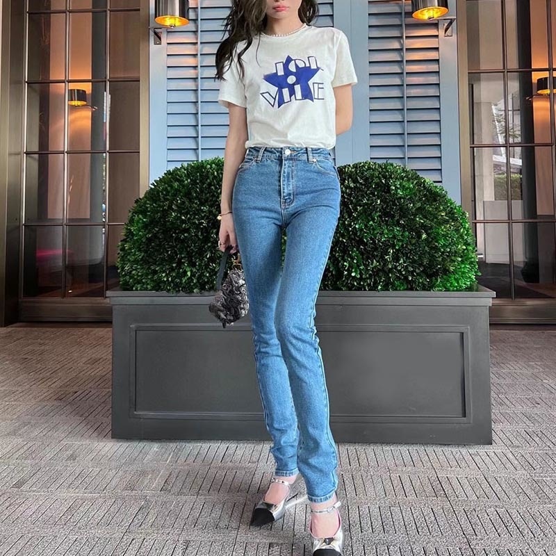 22 Spring Vintage Stretch Metal Logo Tight Jeans Women Casual Button Zipper Blue Jeans Slim Metal Decoration Pocket Pencil Pants