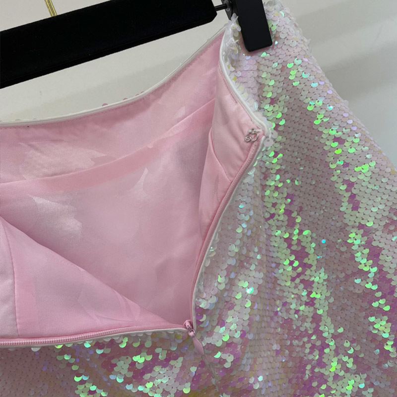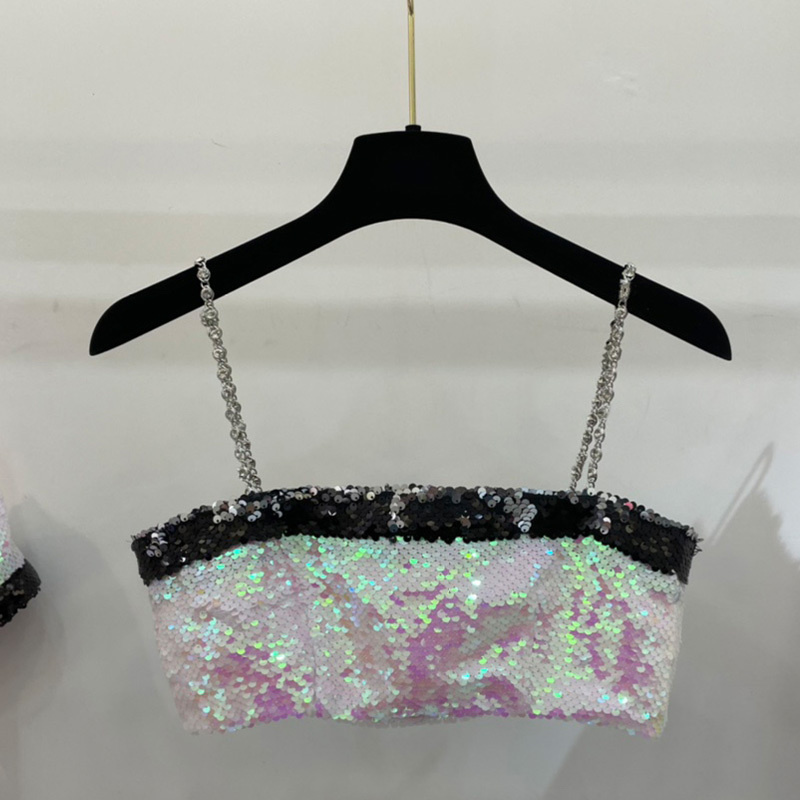22 Summer Sequins Pink Mini Skirt Set Women Sexy Chain Buttons Wrapped Chest Camisole Top Fashion Show Pockets Hips A Line SkirtA0536