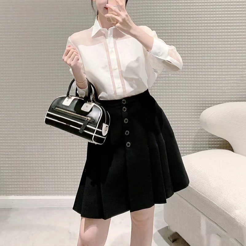 22 Summer Silk Wool Buttons Beige Skirt Women Casual Pleated Blend Black Skirts High Waist Single Breasted Texture Aline Skirts
