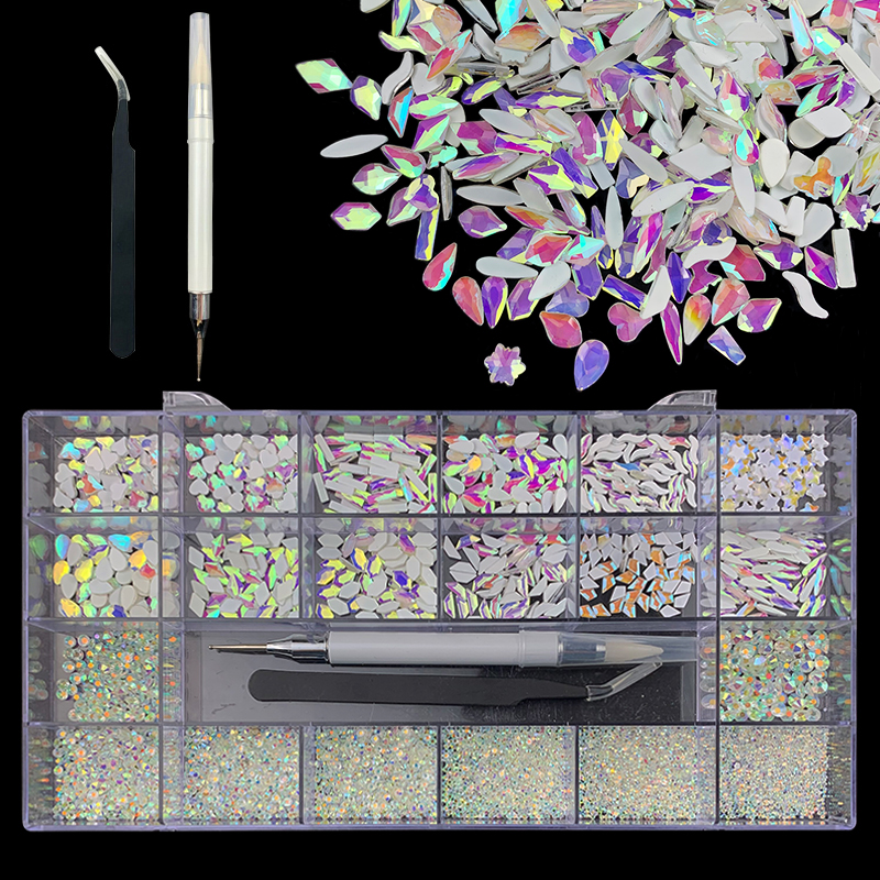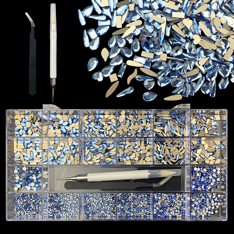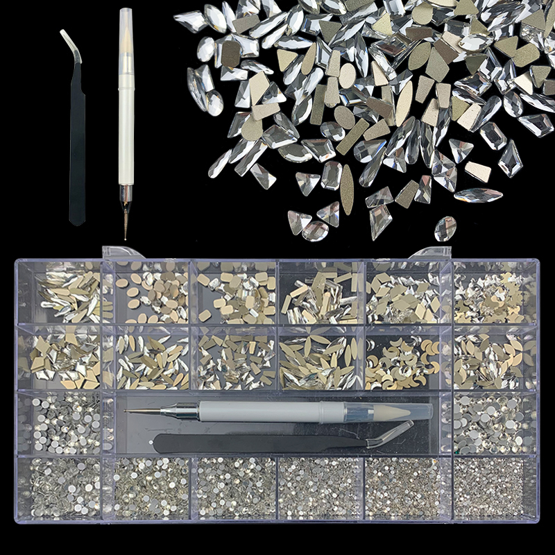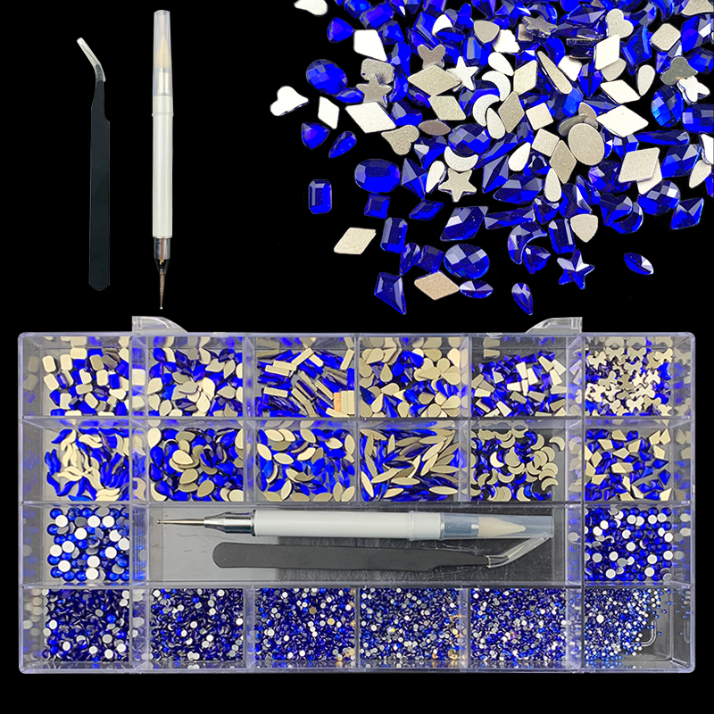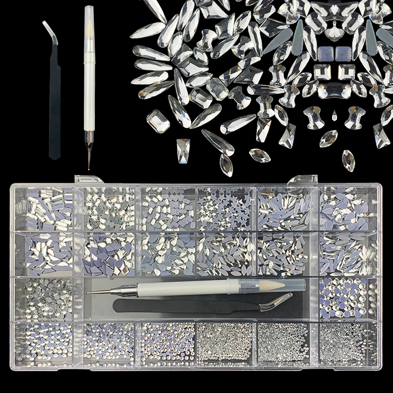 2). 2740pcs Rhinestone set: 240pcs(20x12) k9 crystal glass rhinestones, 2500pcs mix sizes round rhinestones,1pcs wax pen(Crystal or white), 1pcs tweezers for free