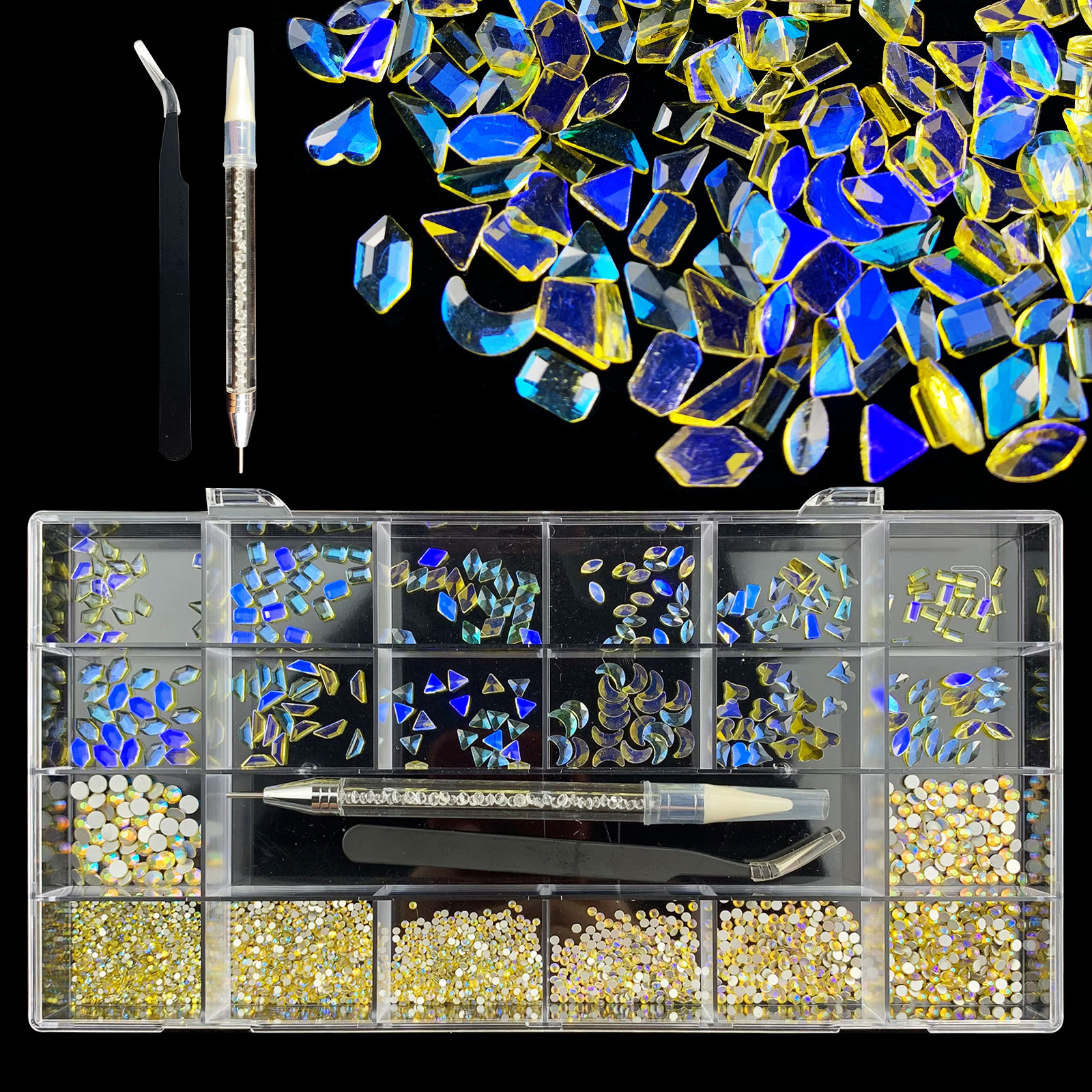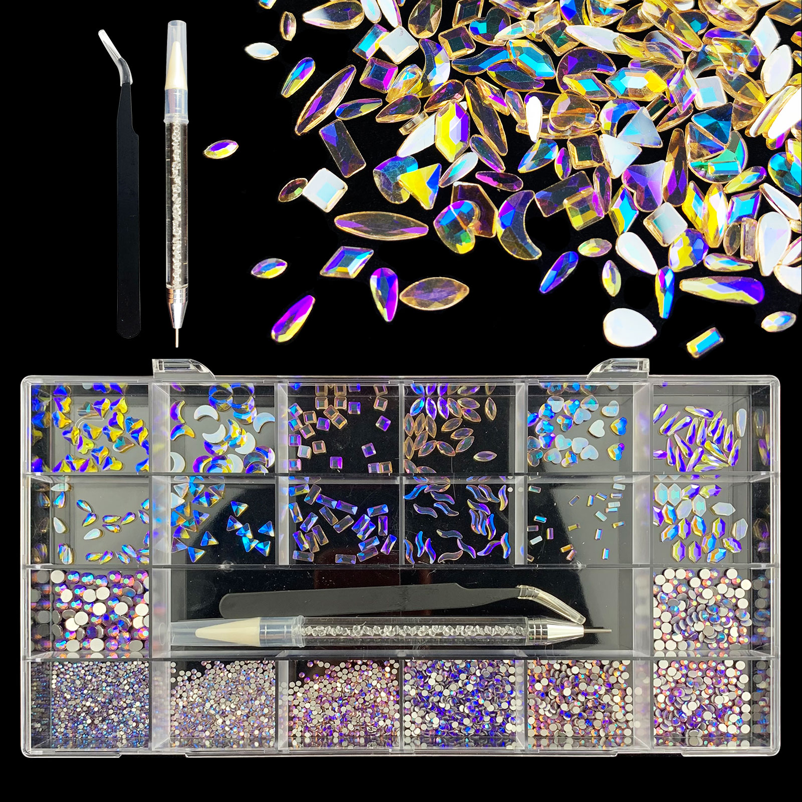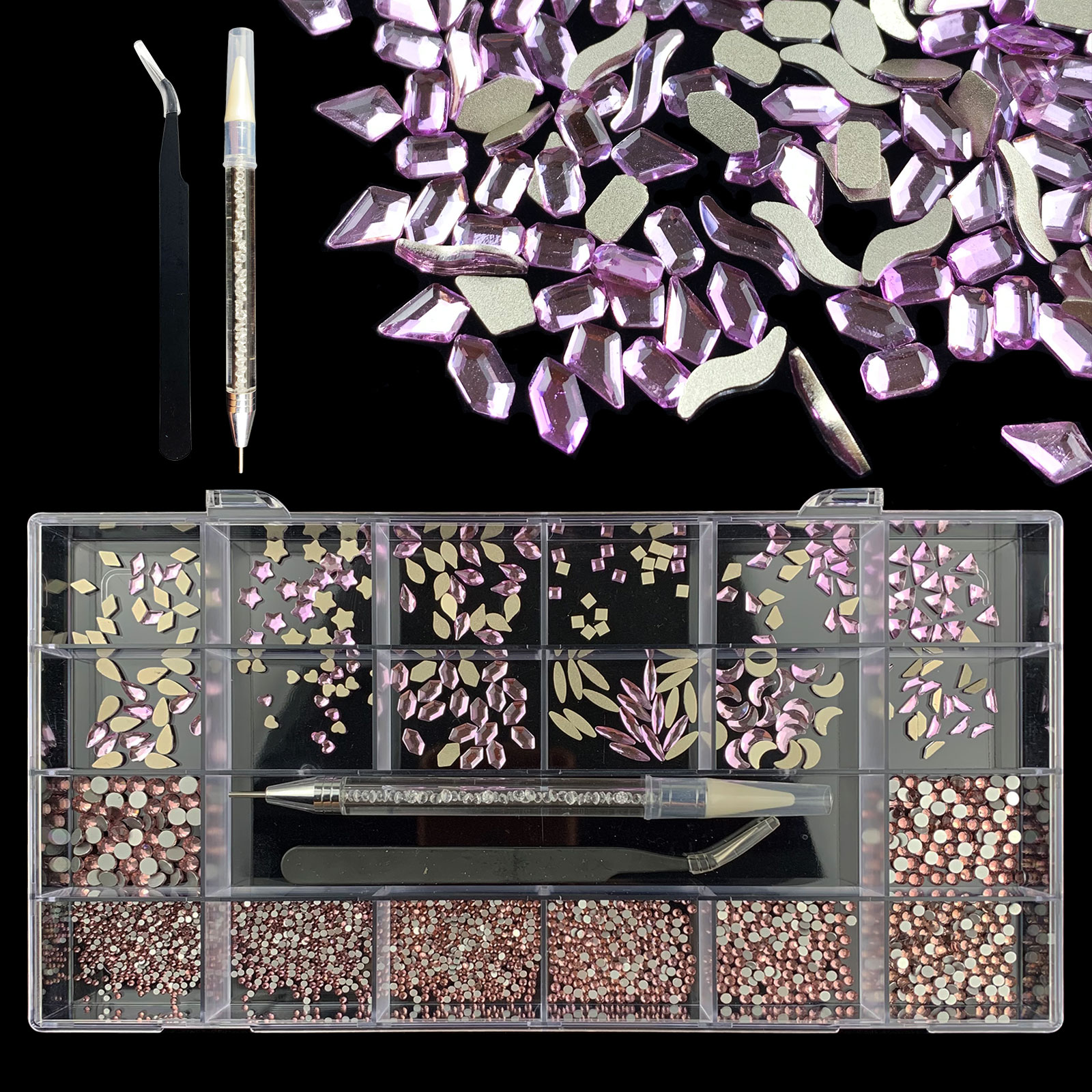 2). 2740pcs Rhinestone set: 240pcs(20x12) k9 crystal glass rhinestones, 2500pcs mix sizes round rhinestones,1pcs wax pen(Crystal or white), 1pcs tweezers for free