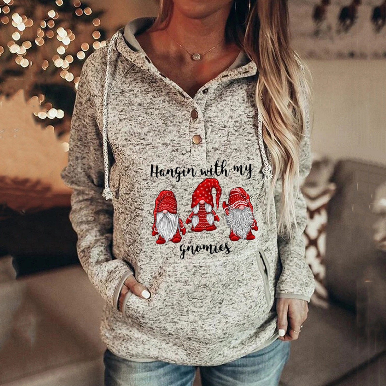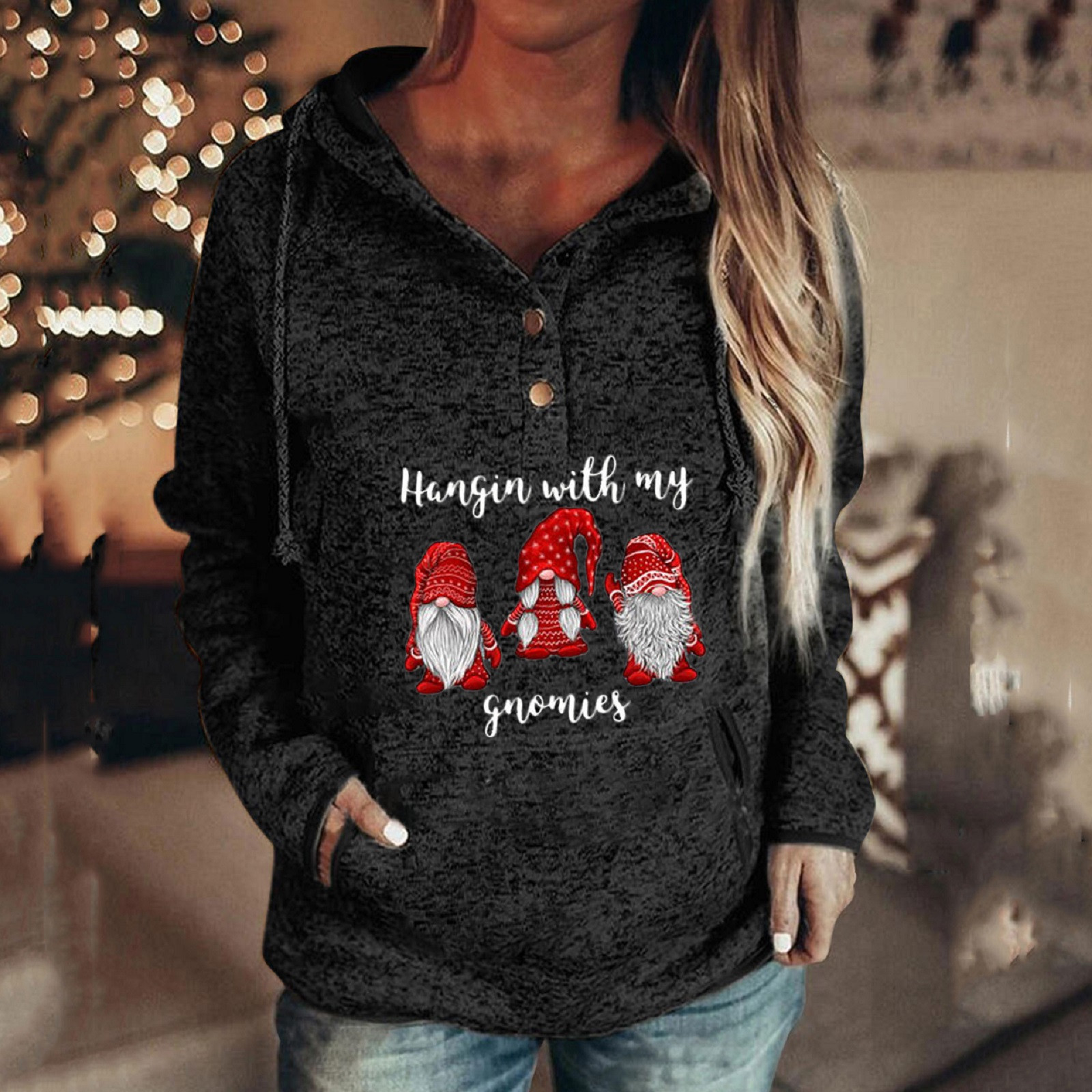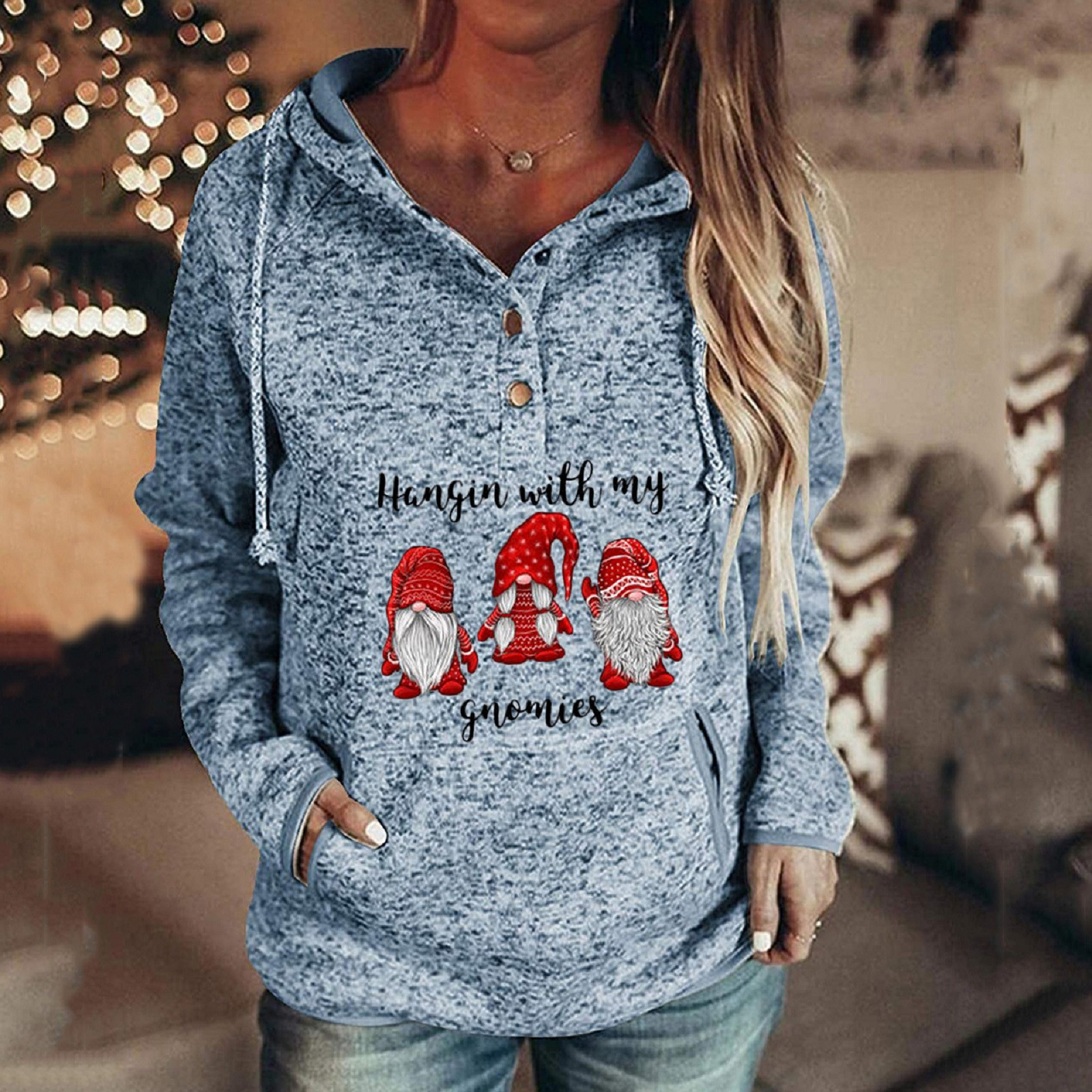 Women Buttons Collar christmas Hooded Sweatshirt Pullover Pockets Drawstring Topt