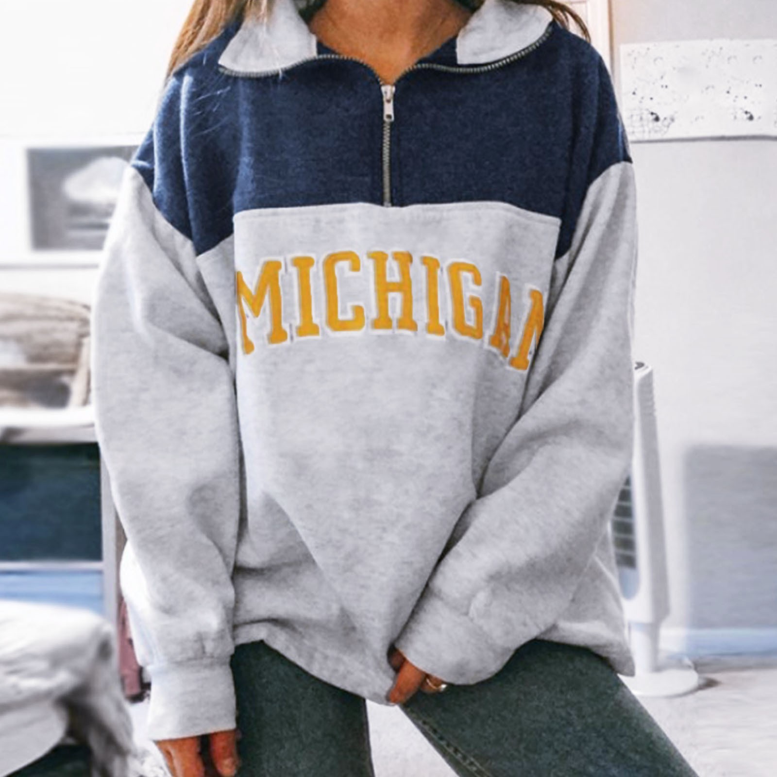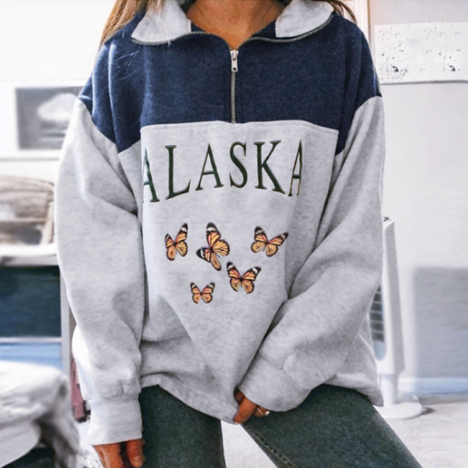 4# Women's Zipper Sweaters Cotton Stand Collar Half Letter Printing Long Sleeve Tops Vintage Grey Casual Loose Sweaters