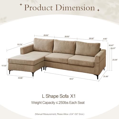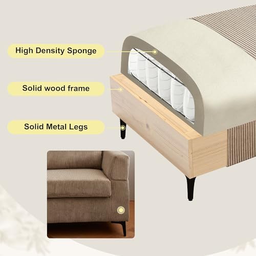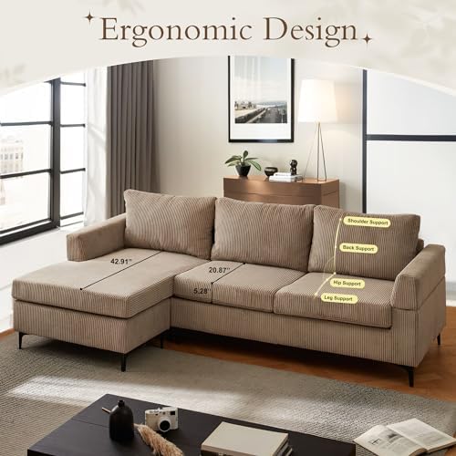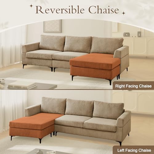 96" Corduroy Sectional Sofa Couches for Living Room,Camel L Shaped Sofa Couch with Reversible Chaise,Comfy 3 Seat Reversible Sofa for Bedroom Office Apartment Convertible Couch (Camel)