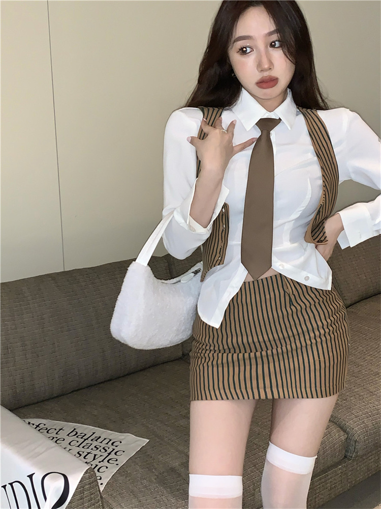 American Retro 3pcs Suit Women V-neck Button Up Vest + Shirt Tie + Mini Skirt Spring Girl Knitted