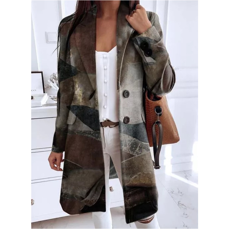 Autumn Winter Print Women Woolen Coats Vintage Lapel Single-Breasted Warm Coat Female Oversized Long Sleeve Casual Outwear