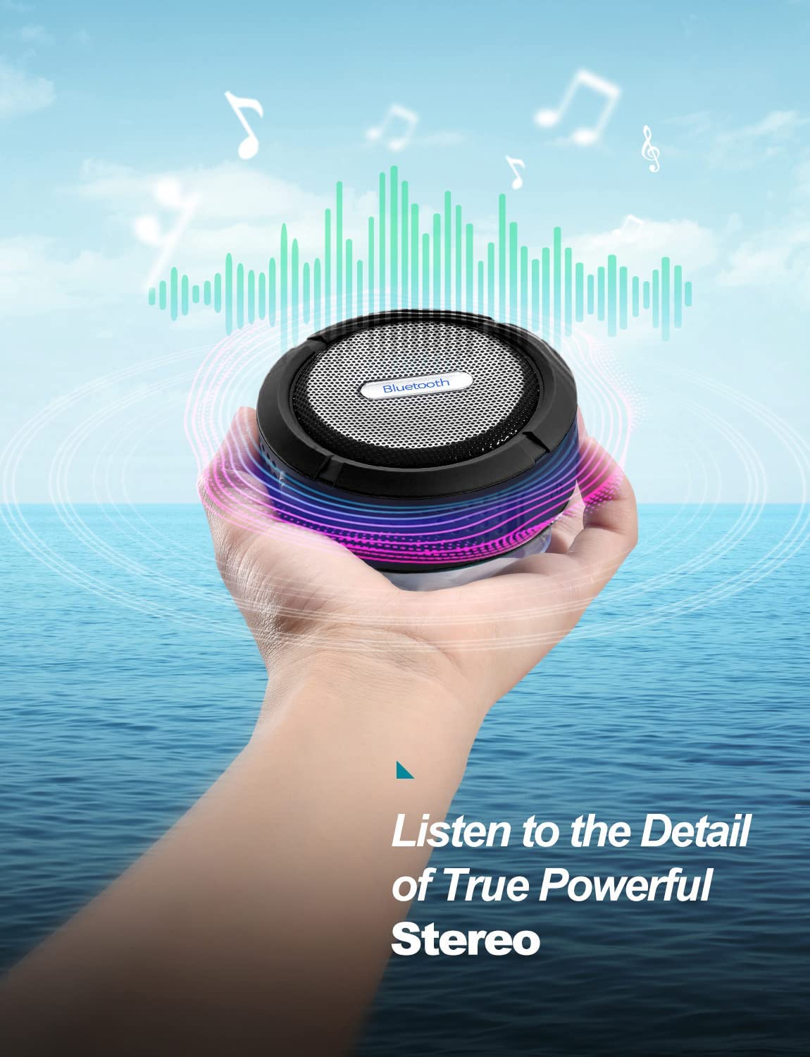 Portable & Lightweight - Equipped with a suction cup and the detachable metal hook, it is easy to attach in shower wall, tiles and mirrors, and you can also use the hook to hang the portable speaker on the backpack when hiking.