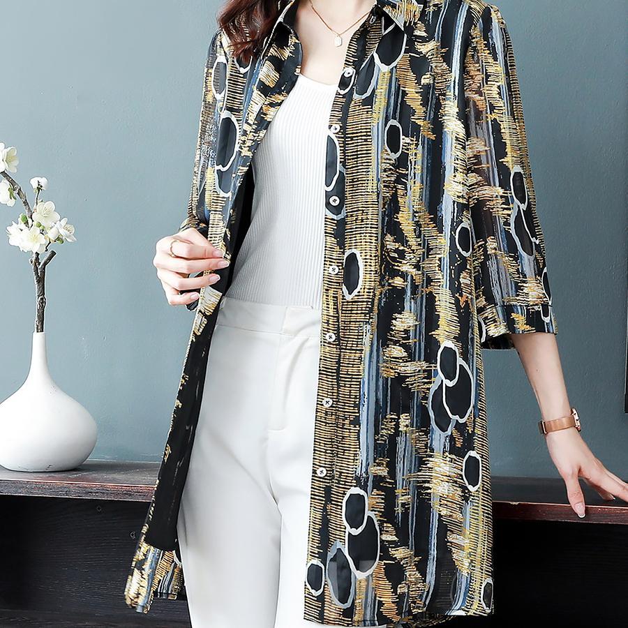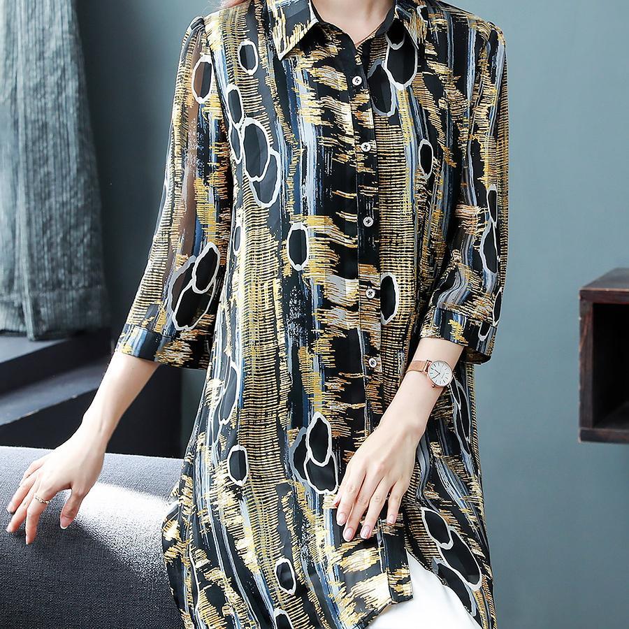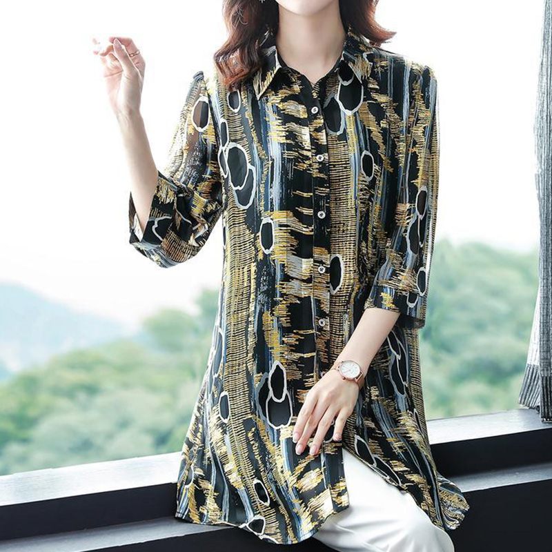 Casual Vintage Print Button Long Shirt Summer Office Lady Polo-Neck Three Quarter Sleeve Loose Tops Ladies Clothing