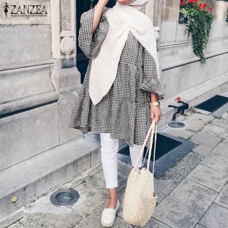 Casual Islamic Clothing Muslim Loose Tunic Ladies Kaftan Blusas Plaid Tops Spring ZANZEA Elegant Women Blouse Femme Chemise
