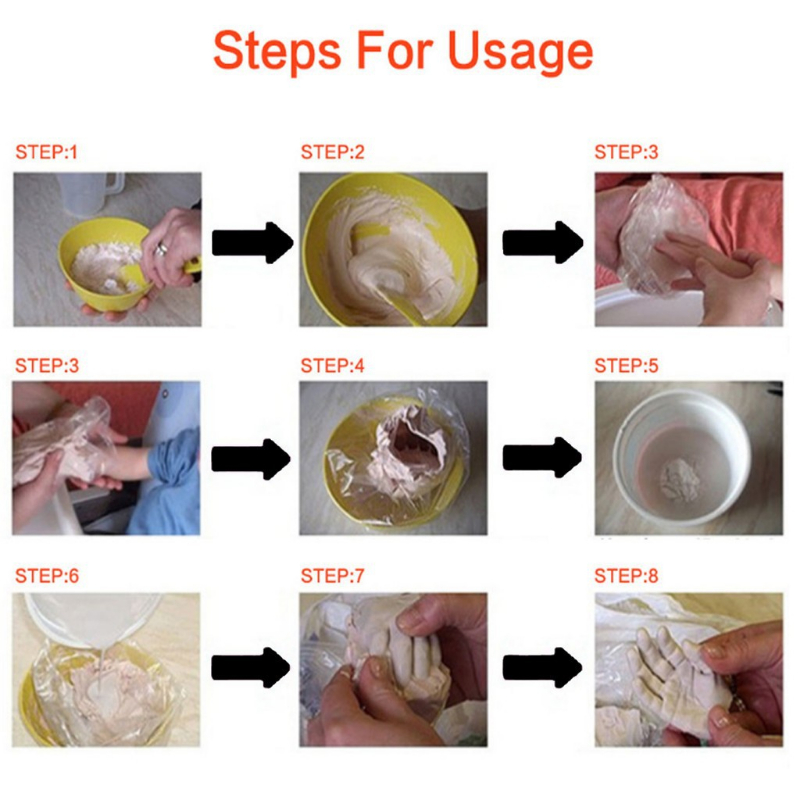 Note:When choosing a container, you must first shape your hands and put them in. There is a small amount of space around the bottom and surrounding areas without your hands touching the container. The container should not be too large. The clone powder is suitable for 10-20 degrees of water temperature. The higher the water temperature, the faster the solidification. The model powder can be tap water at room temperature.