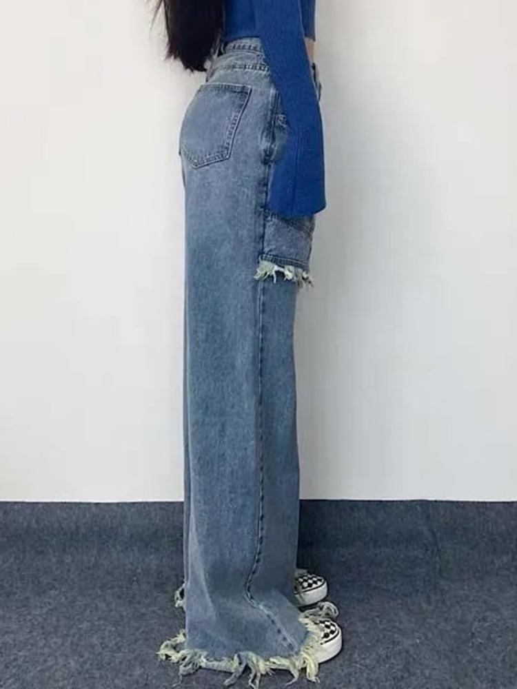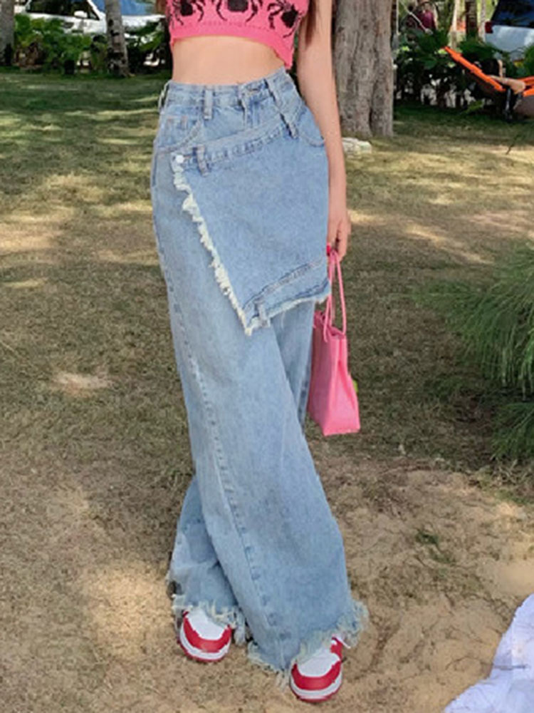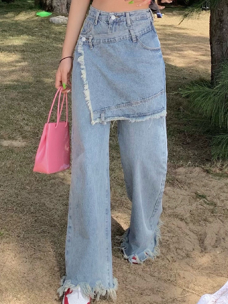 [EWQ] Style Retro Fake Two-piece Stitching Jeans Irregular Frayed Hakama Design High Waist Pants Autumn 16Y355
