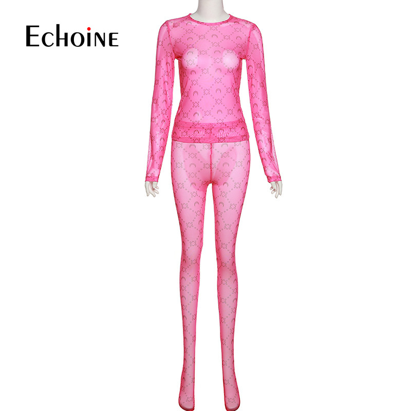 Echoine Summer Women Mesh See Through Print Two Piece Set Long Sleeve Top + High Waist Trousers Sexy Party Nightclub Outfits