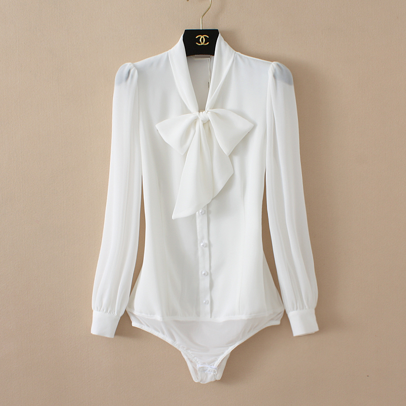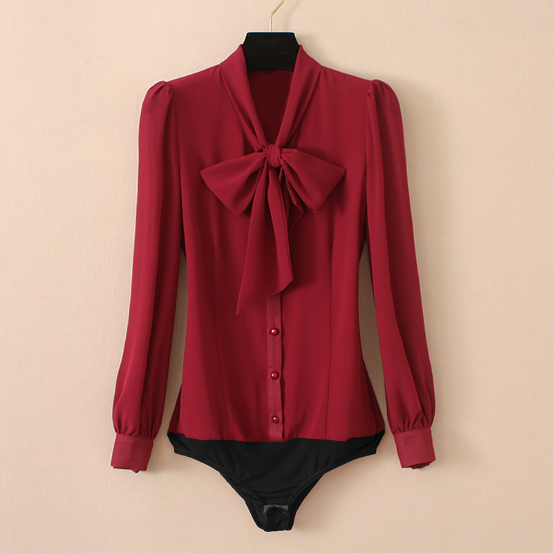 Elegant Chiffon Bodysuits Women Lantern Long Sleeve Bow Tie Neck Office Work Lady Tops and Blouses Female Formal Body Shirt