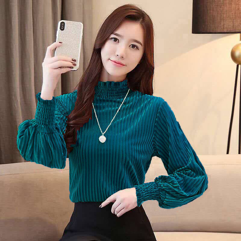 Elegant Shirring Loose Folds Lantern Sleeve Blouse Autumn Solid Color Casual Pullovers Commute Woman Blouses