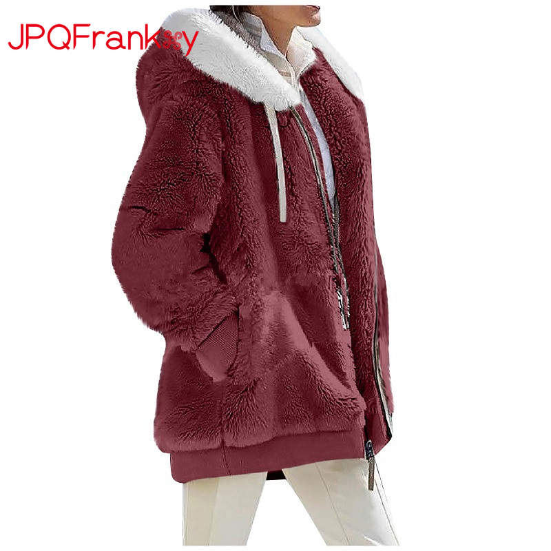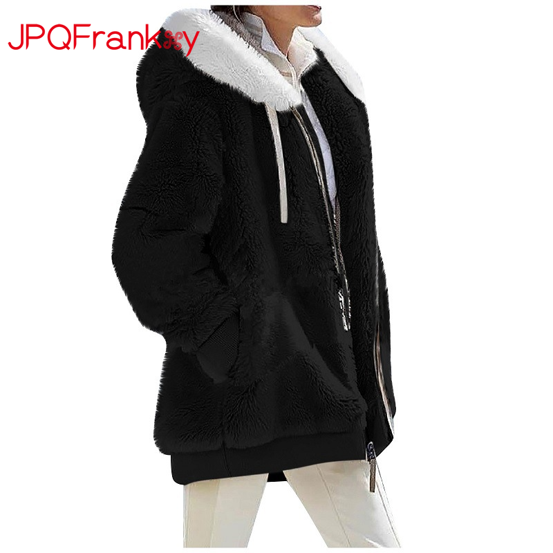 Europe and America Autumn and Winter Loose Plush Long Sleeve Zipper Pocket Hooded Warm Coat Women's Retro Quilt