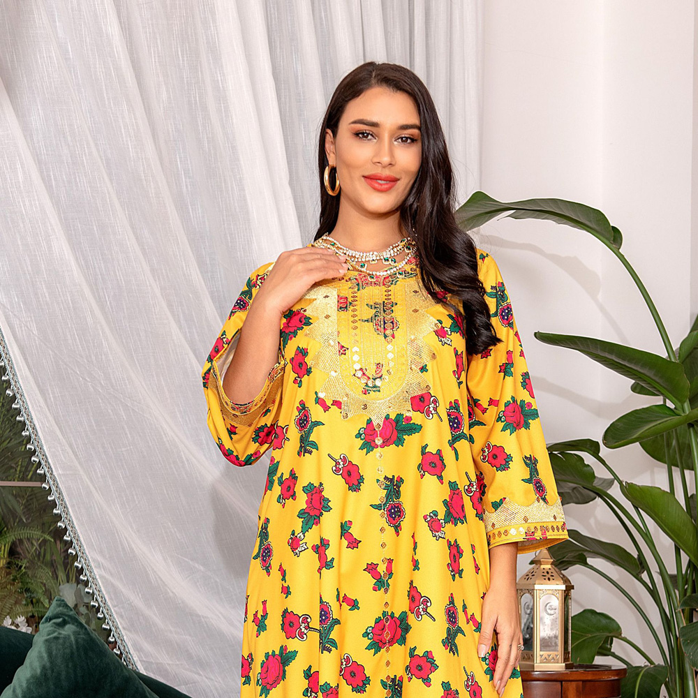 Fancy Dubai Abaya Long Dress Woman Clothes American Muslim Summer Flora Jalabiya White Green Yellow Blue Robe With Belt