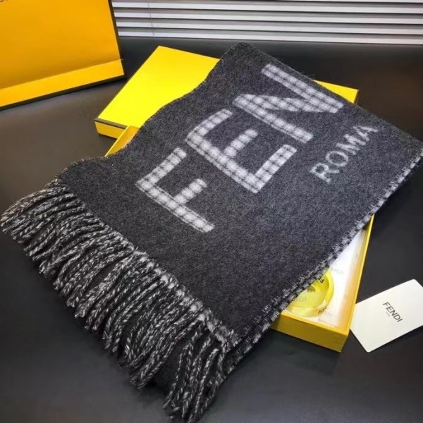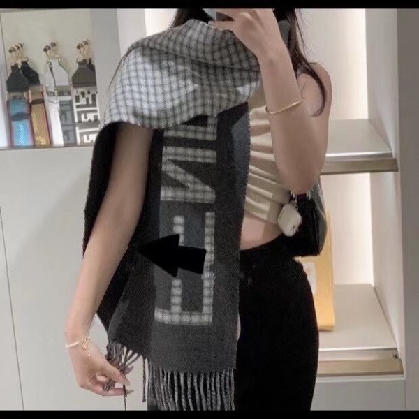 This timelessly elegant and luxurious Fendi scarf in soft wool and cashmere with Fendi Roma oversized lettering, lined with checked motif. Fringed hem, Its long, narrow shape enables it to be worn in many different ways.