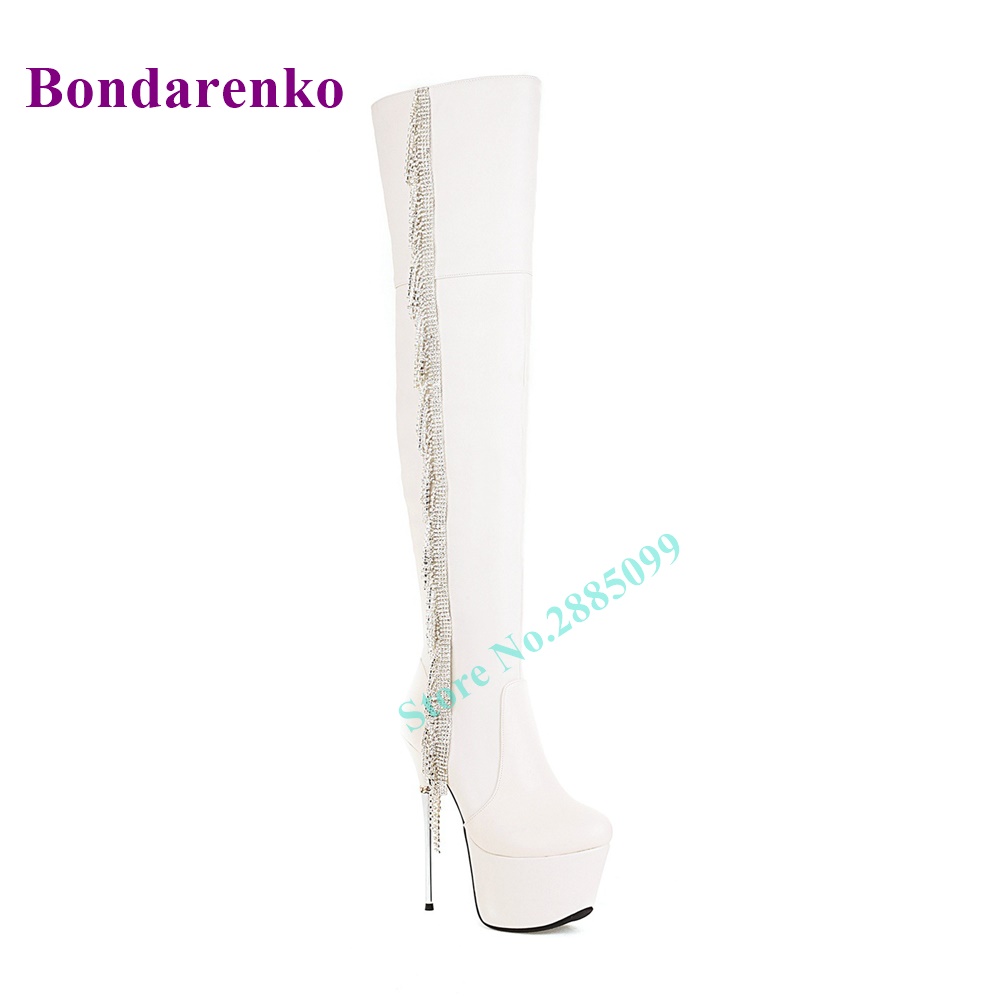 Fringe Platform Stiletto Heel Boots Over The Knee Side Zipper Crystal Leather Boots Women Shoe Autume Winter Party Dress Boots