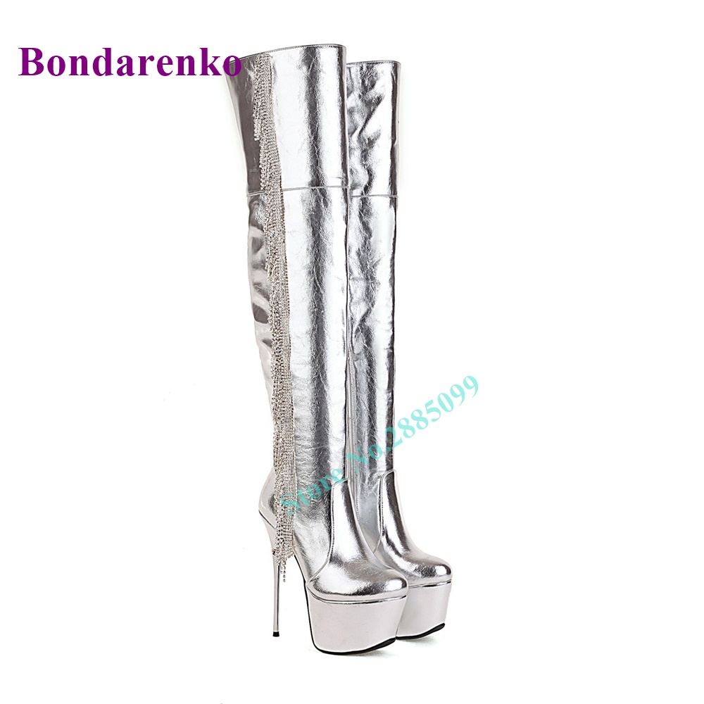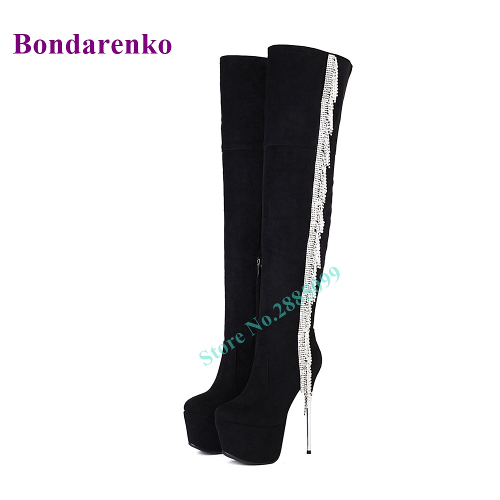 Fringe Platform Stiletto Heel Boots Over The Knee Side Zipper Crystal Leather Boots Women Shoe Autume Winter Party Dress Boots