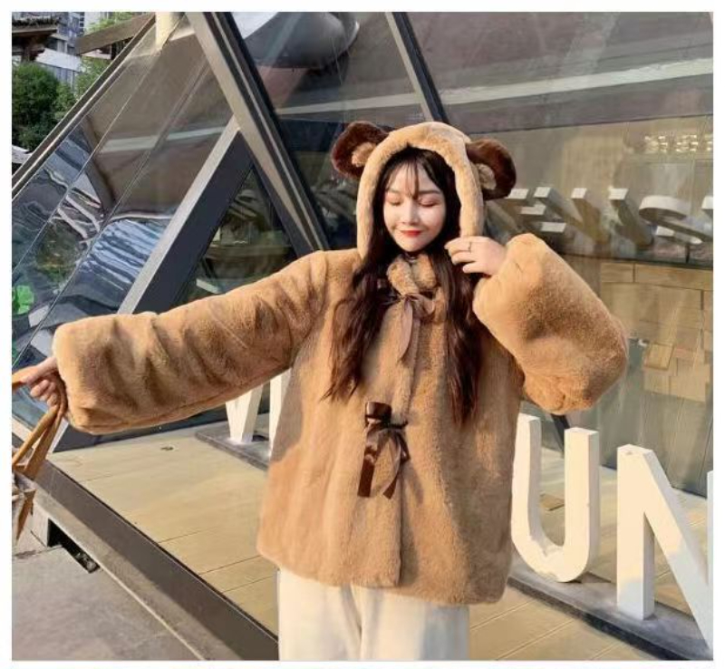 Fur Jacket Women Bear Ear Plush Jacket Winter Cute Preppy Style Oversized Hooded Loose Kawaii Fluffy