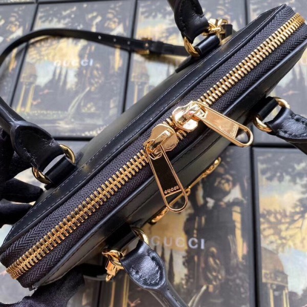A new silhouette introduced to the Gucci 1955 Horsebit line for Spring Summer 2020, the top handle has a domed shape with an optional leather shoulder strap, crafted from black leather. The collection unifies details first introduced on the original bag that inspired the line from over six decades ago with a modern spirit, highlighting the Horsebit. Part of Gucci’s genetic code, the double ring and bar design has been established as one of the most distinctive elements among the House symbols borrowed from the equestrian world.