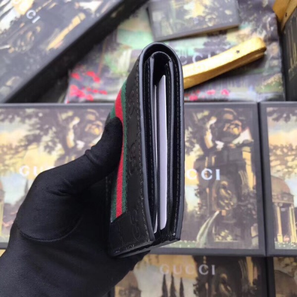 A combination of two of Gucci’s most recognizable icons: the GG motif and the Web. This bi-fold wallet is made in heat debossed Gucci Signature with Gucci Web stripe detail.