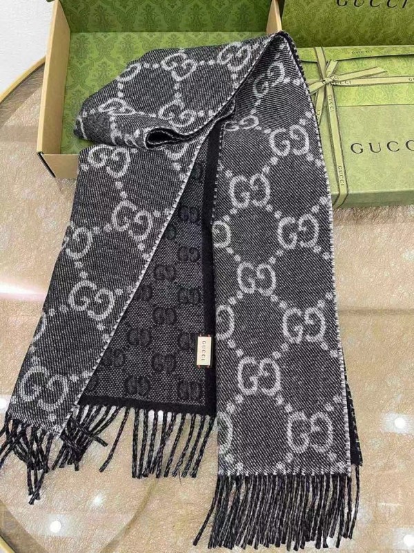 The front and back GG pattern in reverse colors adds a playful note to this soft jacquard wool scarf. The monogram motif dates back to the 1970s, recalling the initials of the founder Guccio Gucci. Here it is presented in a contrasting shade of grey, while black tassels complete the style.