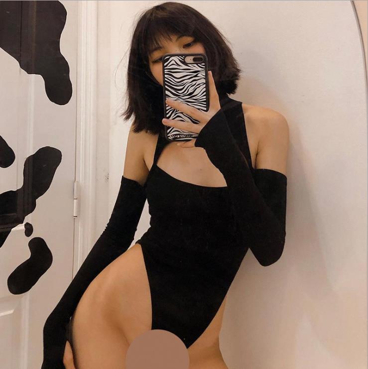 High Women’s Long-sleeved Bodysuit Solid Color Hollow Off-shoulder Half High Collar Jumpsuit