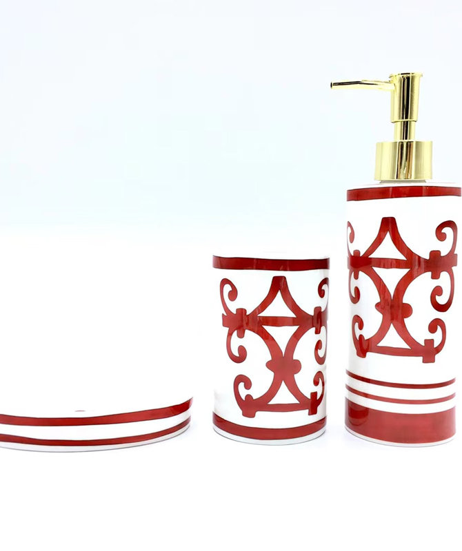 Set composition: Liquid soap dispenser, glass 2 pieces, toothbrush cup, soap dish