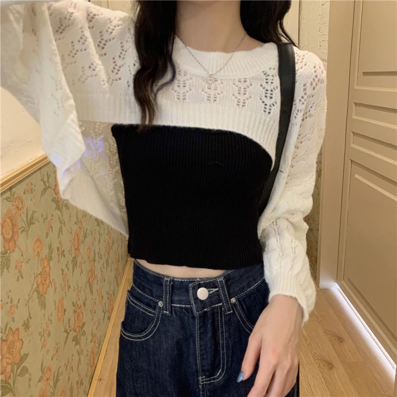 Knitted Shrugs Women Solid Loose Crop Top Hollow Out Designer Hipster New-arrival Soft Teenagers Full Sleeve All-match Ulzzang