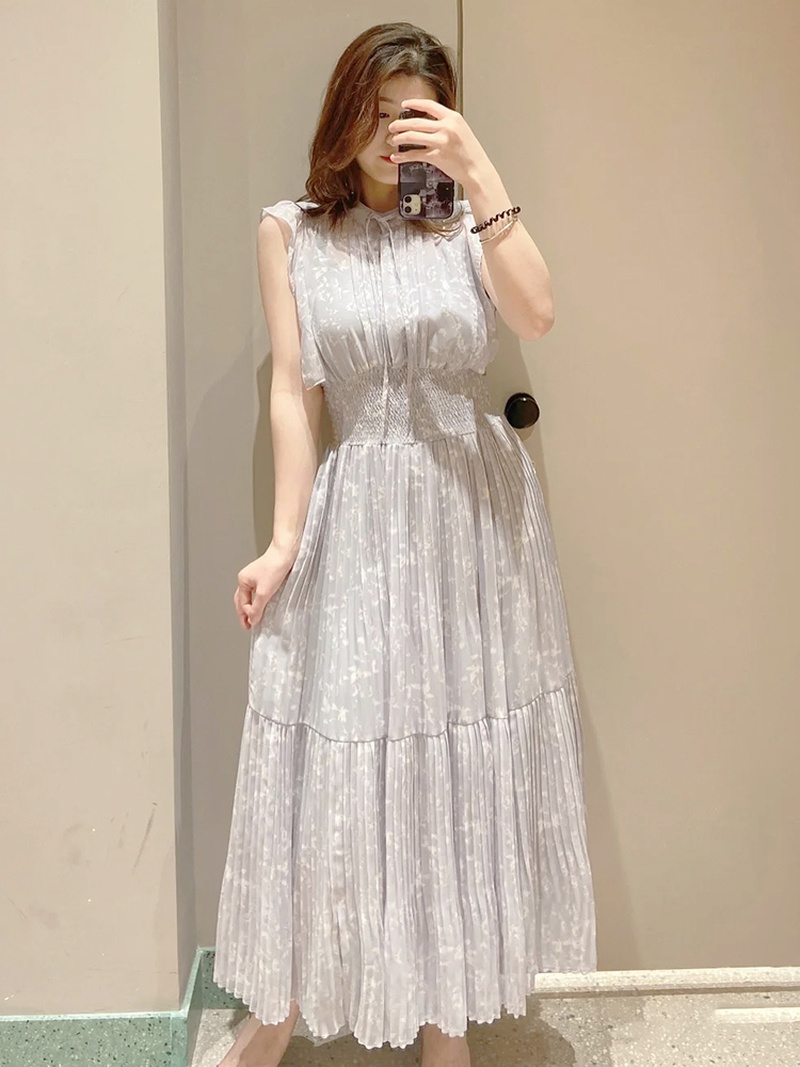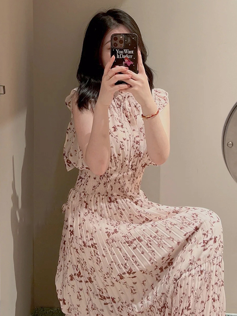 Kuzuwata Bow Drawstring Neck Small Flying Sleeves Print Slim Waist Pleated Robes Japanese Vestidos Sweet Gentle Fairy Dress