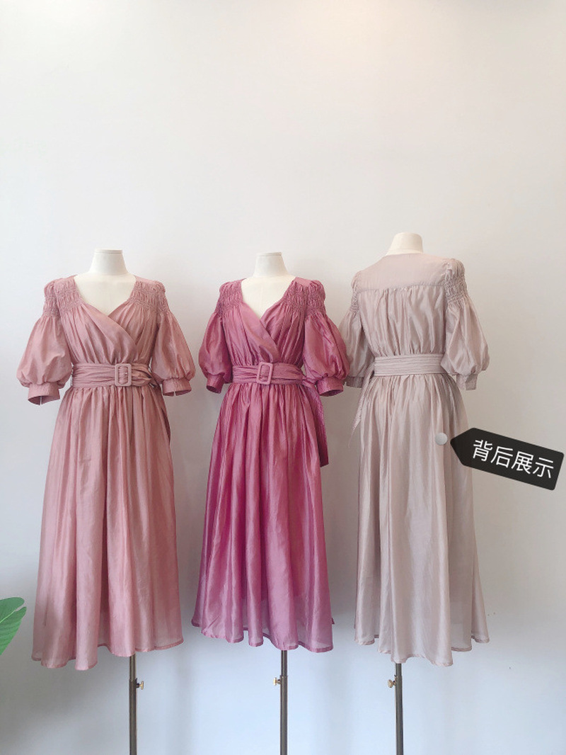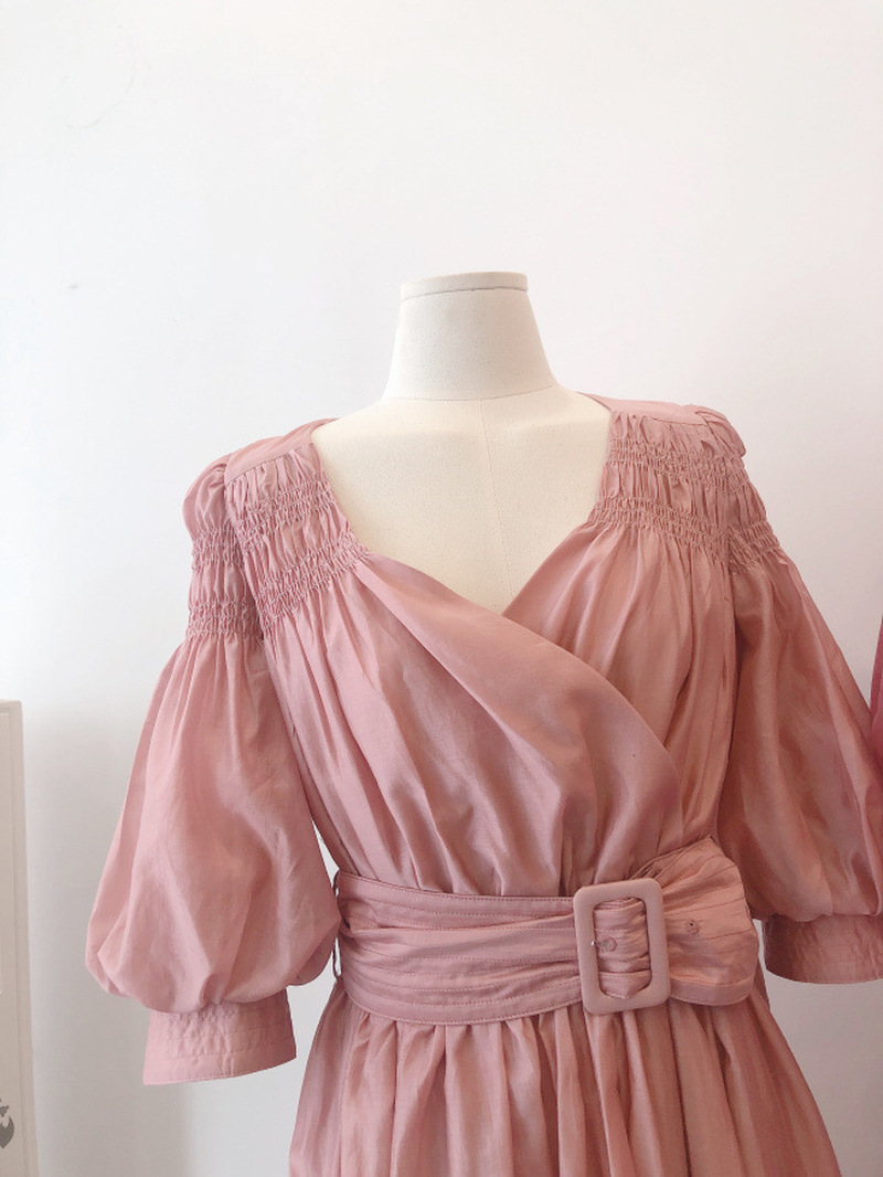 Kuzuwata V Neck Elastic Shoulder Lantern Sleeve Femme Robe Summer Vestidos Cross Slim Waist Pleated Solid Dresses with Belt