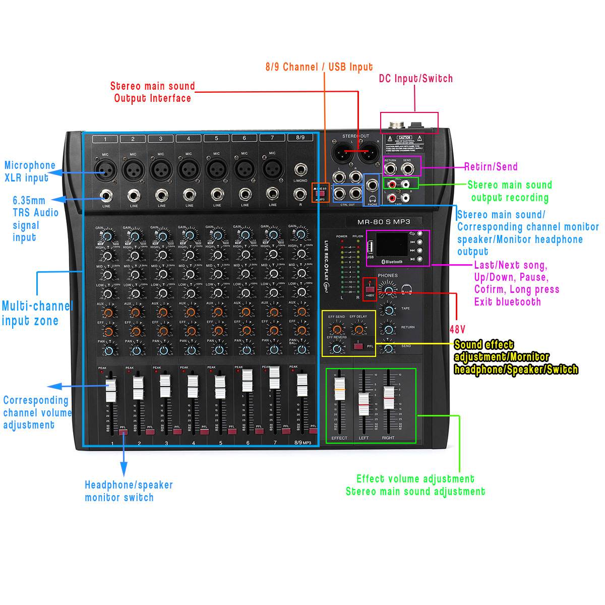 - The 7 channel microphone input interface, interface meticulous, stable transmission, less distortion.
