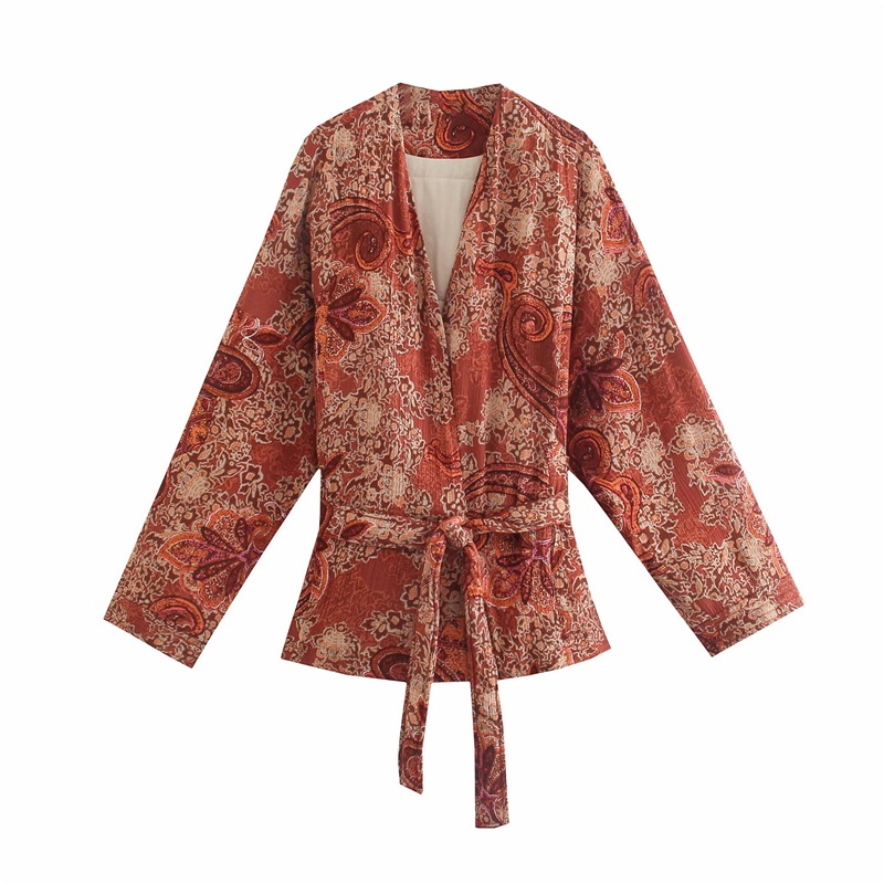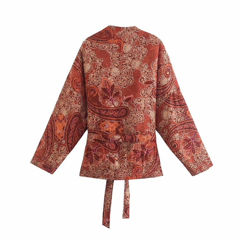 MESTTRAF Women With Belt Paisley Print Kimono Cotton Coat Vintage Long Sleeve Pockets Female Outerwear Streetwear
