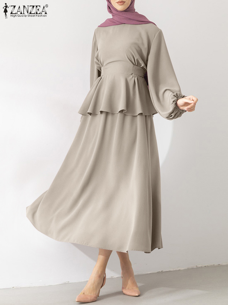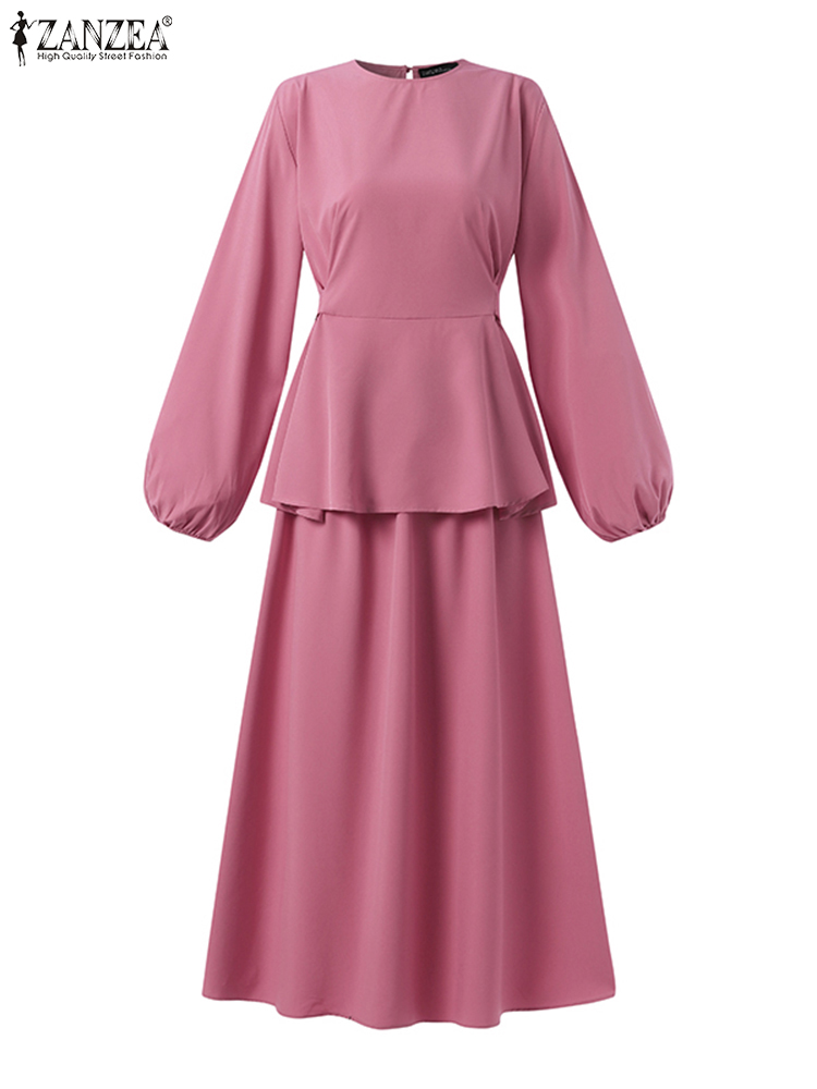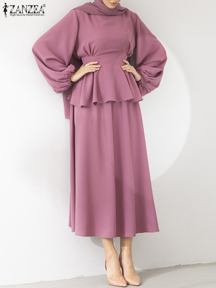 Muslim Sets Women Autumn Matching Sets ZANZEA Puff Sleeve Bllouses A-Skirts Female Marocain Turkish Tops Islam Clothing