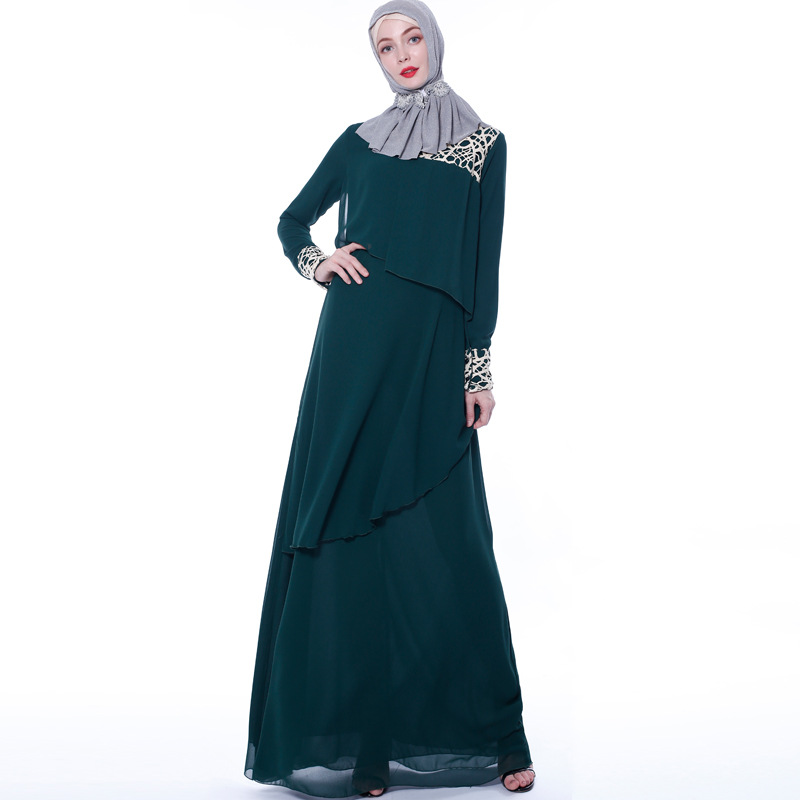 Muslimah Jubah Abaya Long Sleeve Dress Abaya Dubai Chiffon Dress  Kaftan Vira Lace Stitching Elegant Dress European Clothing