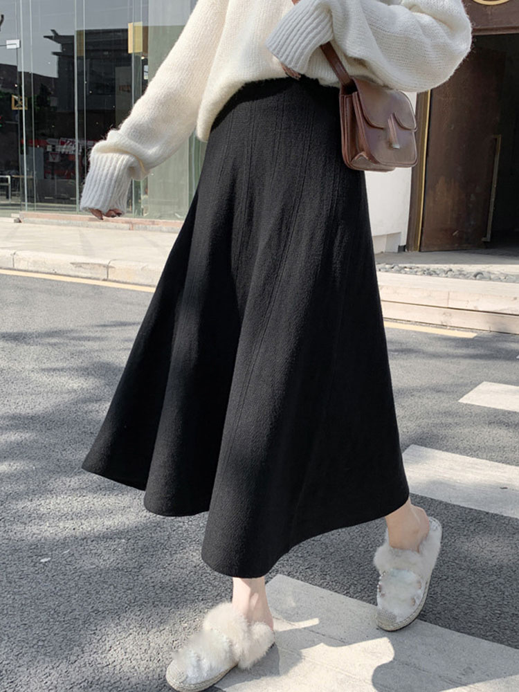 OHRYIYIE Women Thick Knit Skirt Autumn Winter Female High Waist Warm A-line Skirt Women Casual All-match Midi Long Skirt Lady