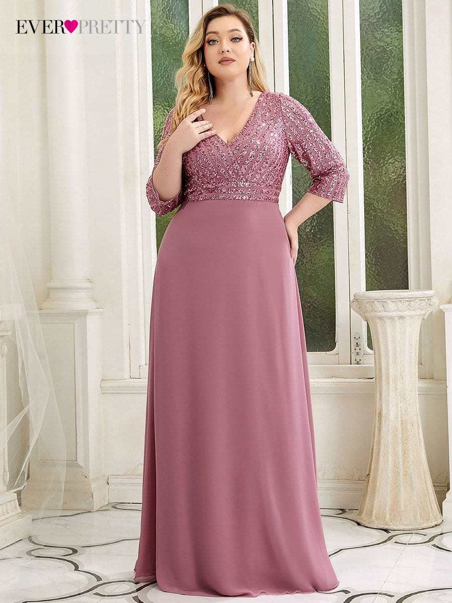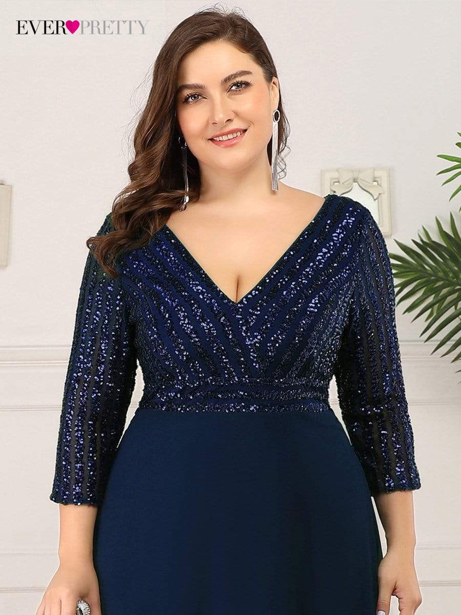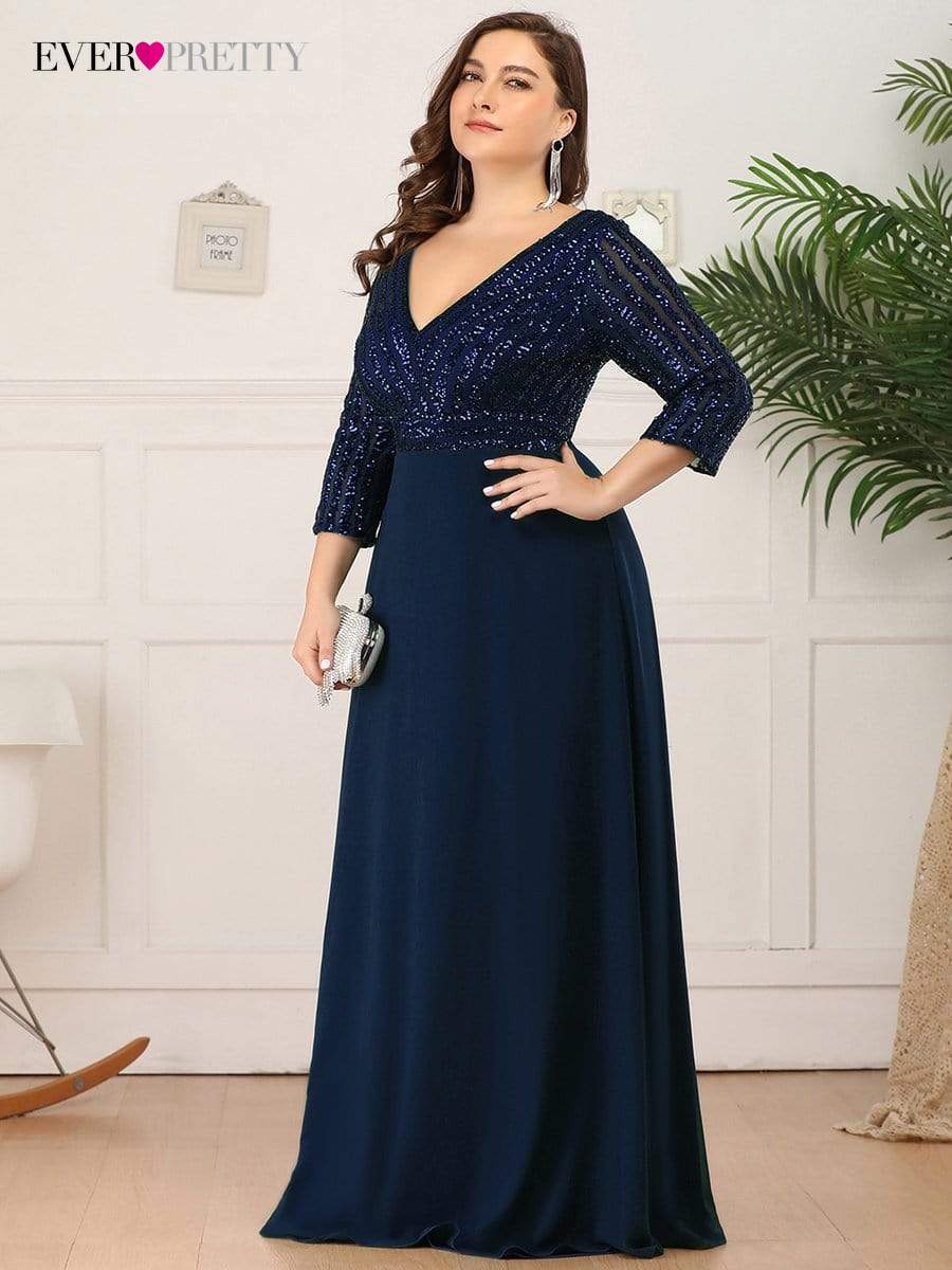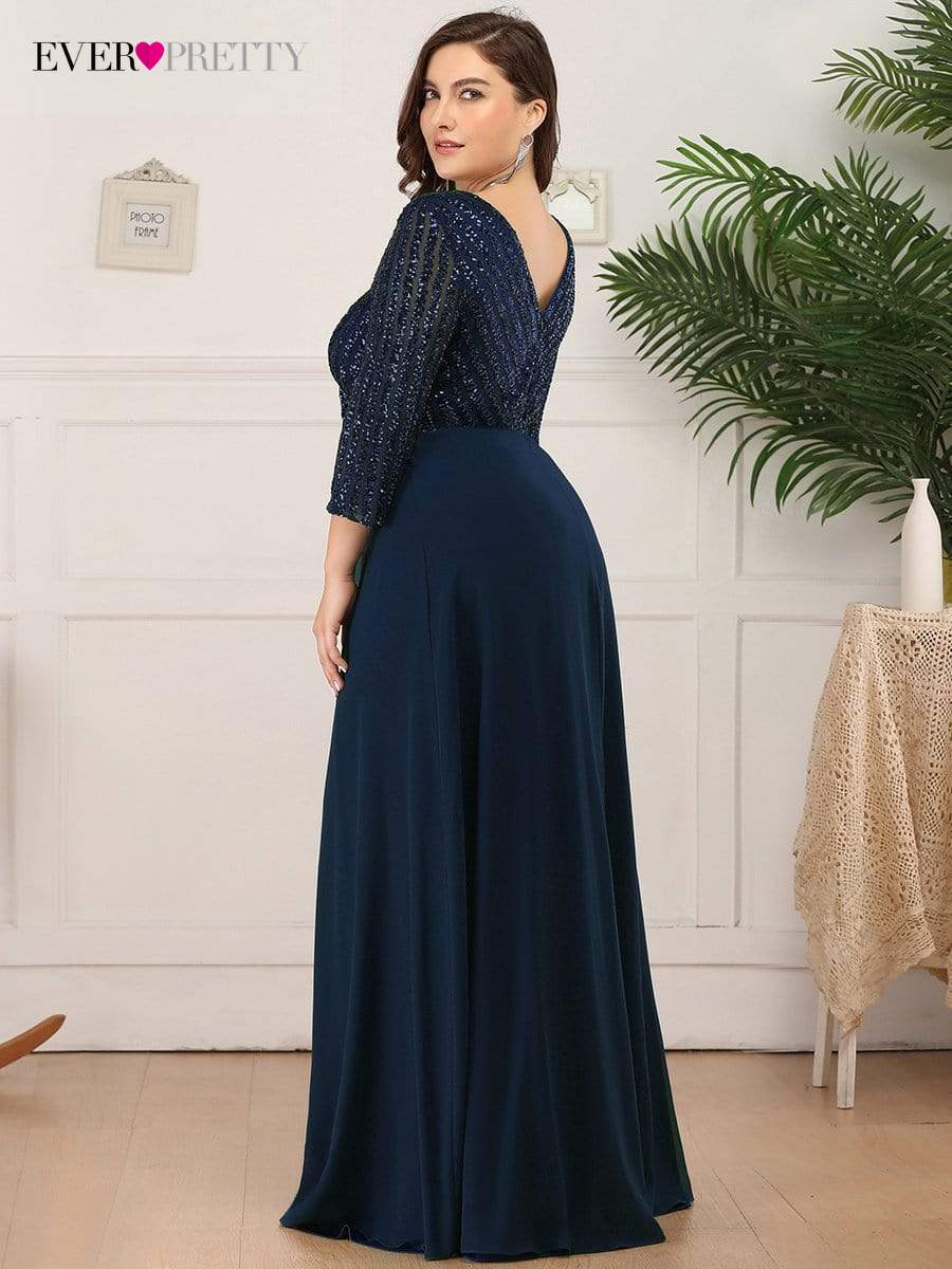 Plus Size Elegant Evening Dresses Long A-LINE V-Neck Wrist Sleeve Floor-Length Gown Ever Pretty of Sequine Prom Women Dress