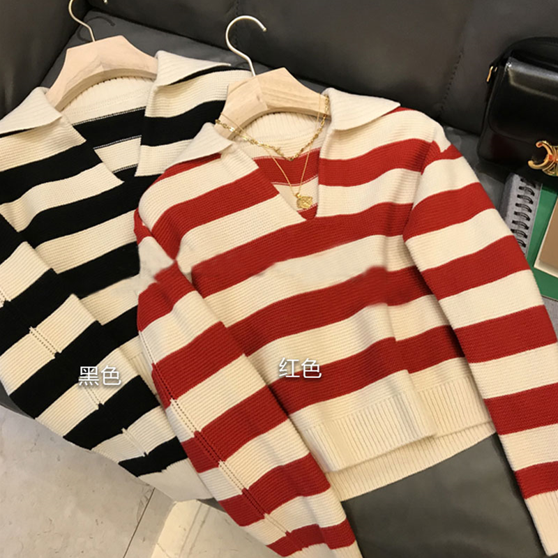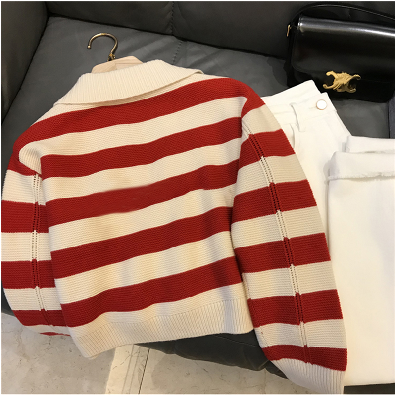 Polo Collar Sweater Women's Autumn And Winter Striped Red Casual Loose Pullover Short Knitted Sweater Long-sleeved Top Y2K