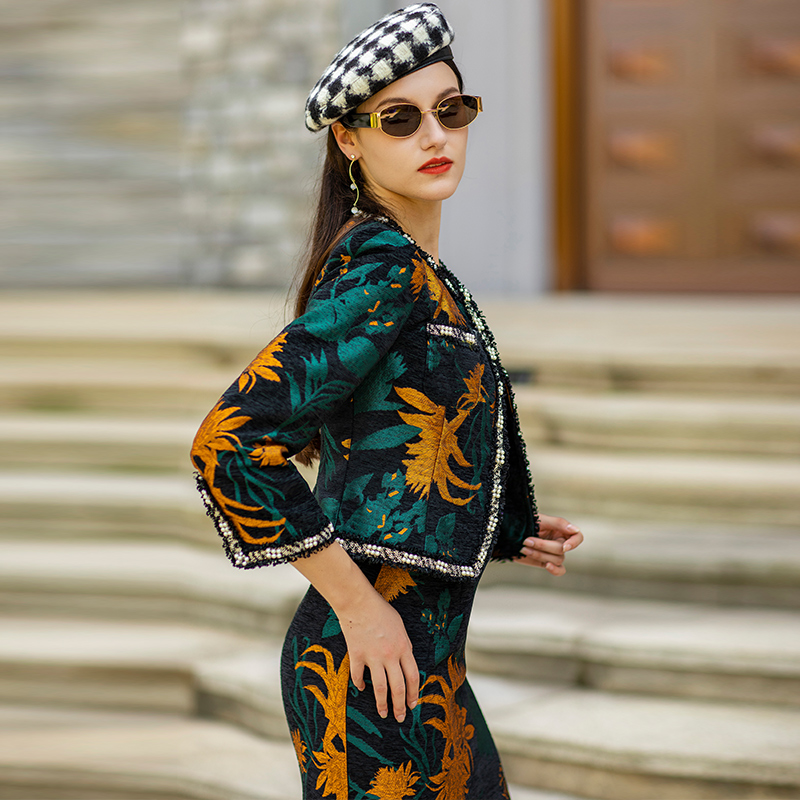 Spring Autumn Beading Suit Dress Women 2 Piece Set Blazer Women Straight Jacquard Dress for Women Suits Indie Folk