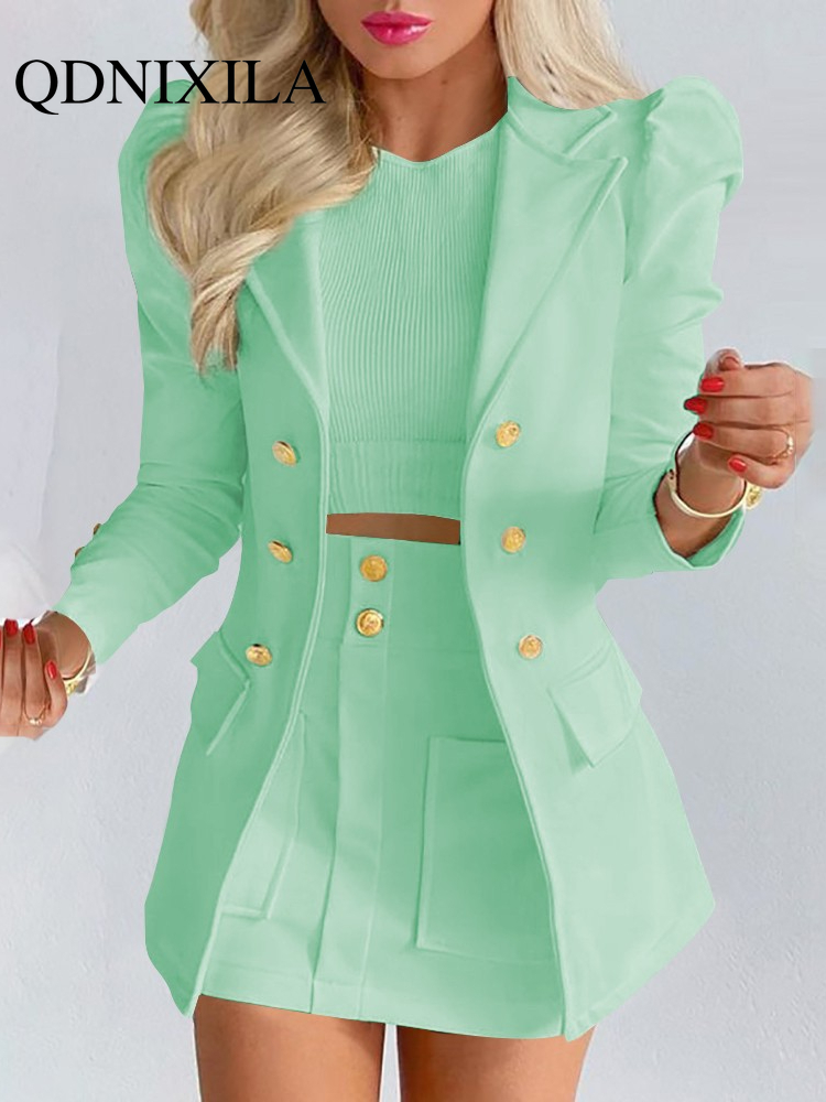 Spring and Autumn Leisure Suit Women's Double-breasted Long Sleeve Skirt Suit 2-piece Office Women Dress Skirt Set