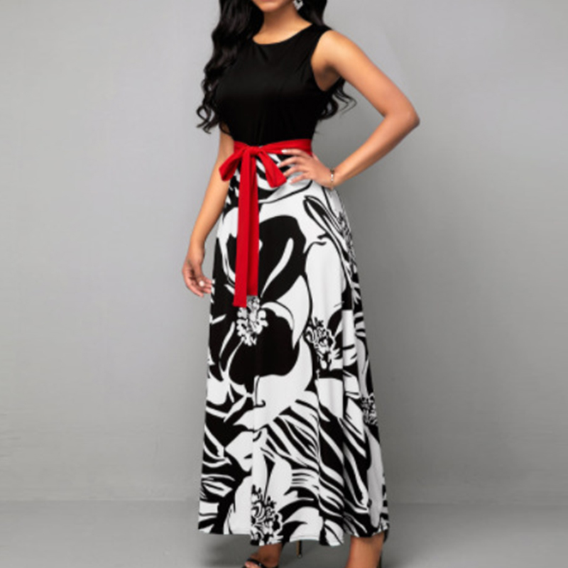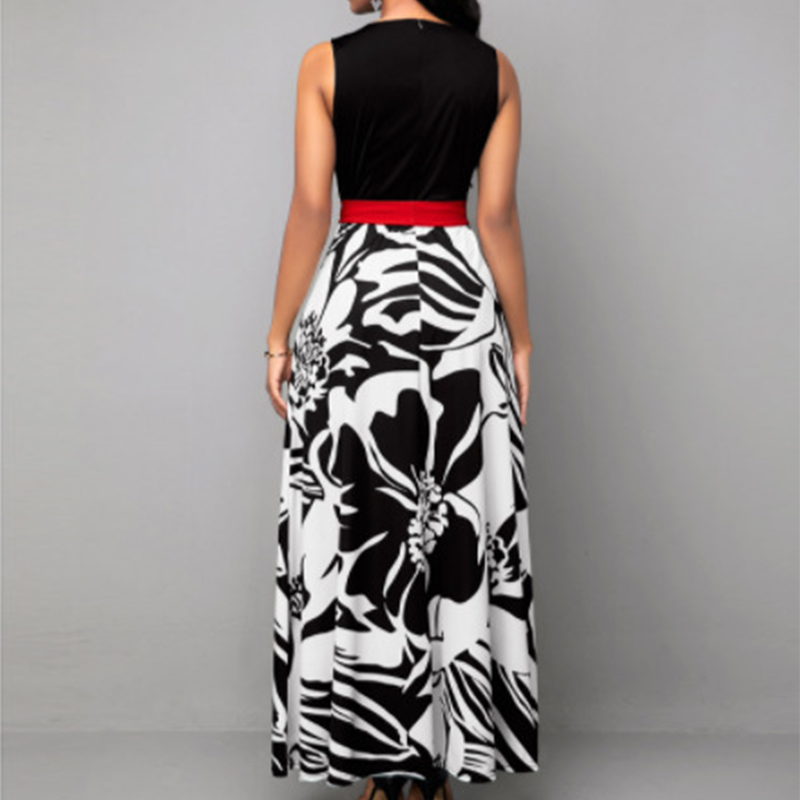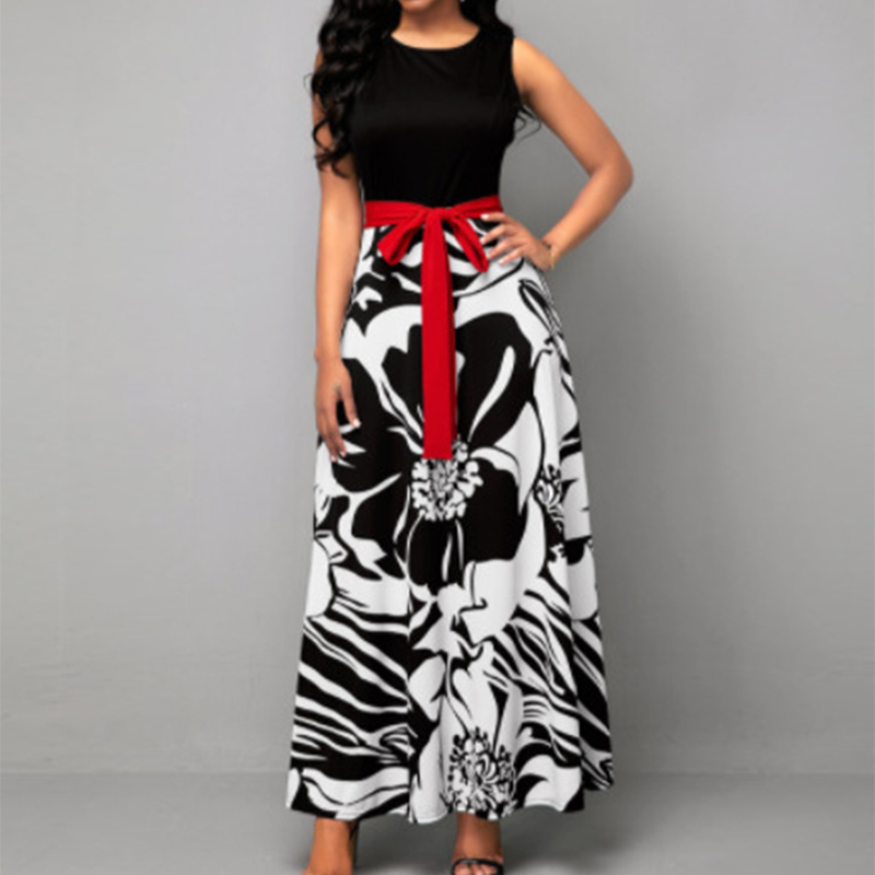 Summer Women's Sleeveless Printed High Waist Patchwork Lace Up Casual Long A-line Dress Elegant Holiday Robe Dresses