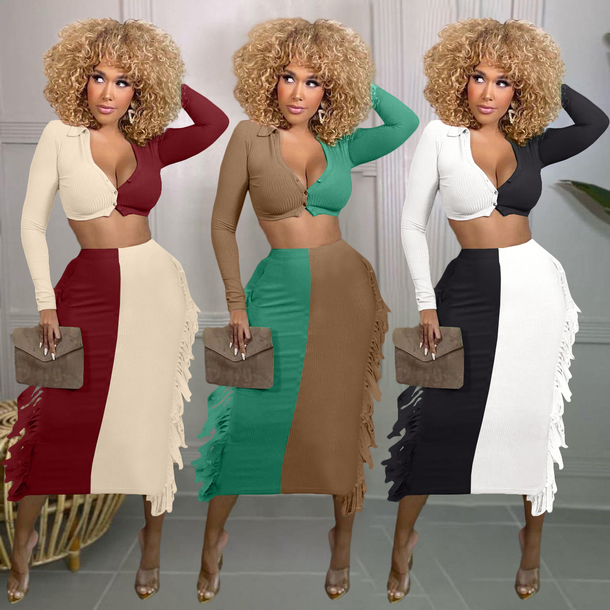 Vavcy spring autumn dress suit green t-shirt + wrinkle tassel sexy set
