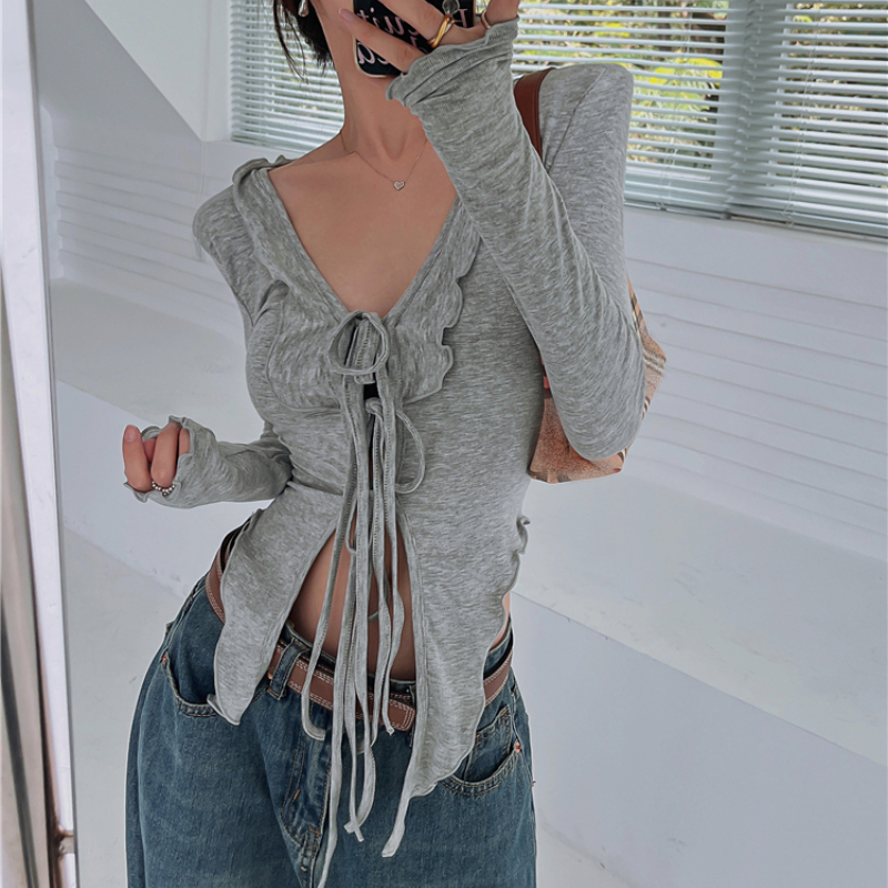 V-neck Sexy Hollow Lace-up Solid Color Long-sleeved T-shirt Women Summer Irregular Ruffled Casual Crop Tops