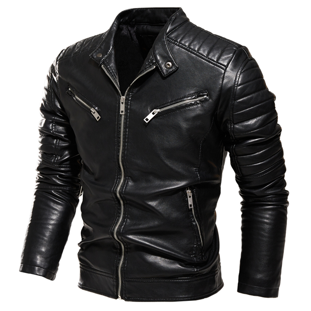 Winter Black Leather Jacket Men Fur Lined Warm Motorcycle Jacket Slim Street BLack Biker Coat Pleated Design Zipper