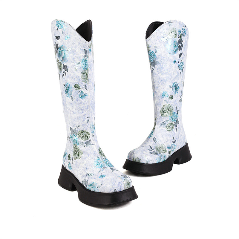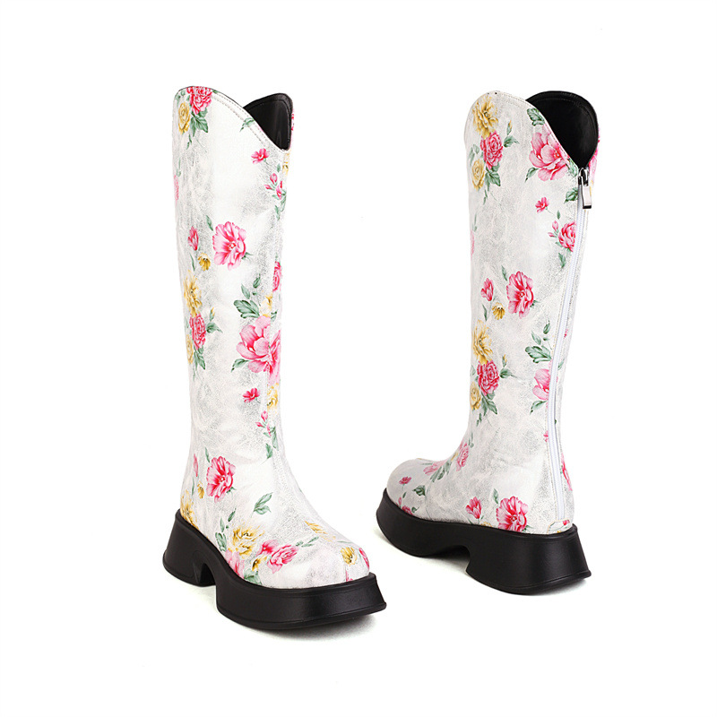 Woman Knee High Boots Trend Winter Retro Round Head Small Platform Women Shoes Casual Mid Heel Print Boots