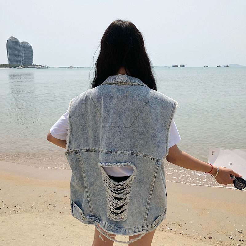 Women Denim Vest Coat Free Size Open Stitch Hole Vintage Sleeveless Vest Jacket Women Vests Denim Cotton Waist Coat Clothing