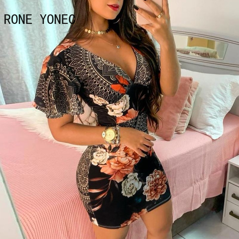 Women Elegant Dress Floral Butterfly Print Ruffles Bodycon Dress Casual Mini Dress Vacation Dress