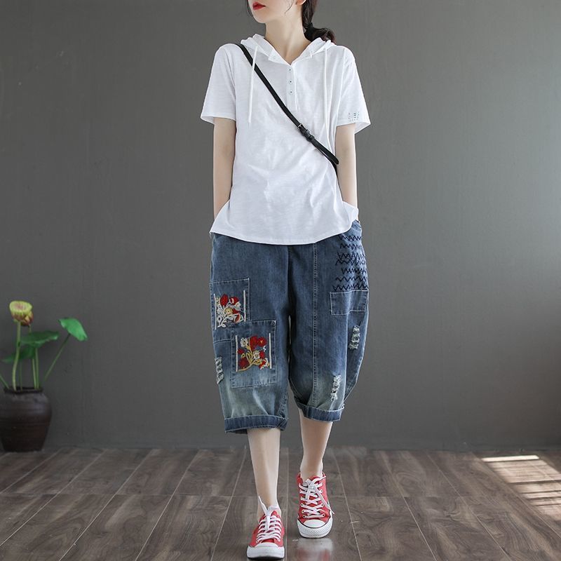 Women's Jeans Cropped Trend Baggy Pant Woman High Waist Mom Oversize Pants Wide Leg Waisted Ripped Graphic Embroidery